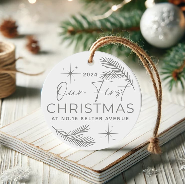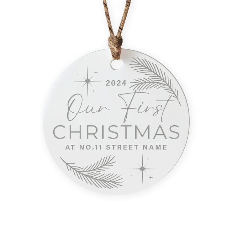 Celebrate your first Christmas in your new home with this beautifully crafted ornament! Made from 3mm thick white acrylic, 6cm diameter ornament features an elegant design that captures the joy of your milestone moment. With charming illustrations and typography, this ornament comes with a rustic hemp string, perfect for hanging on your Christmas tree or displaying as a keepsake.