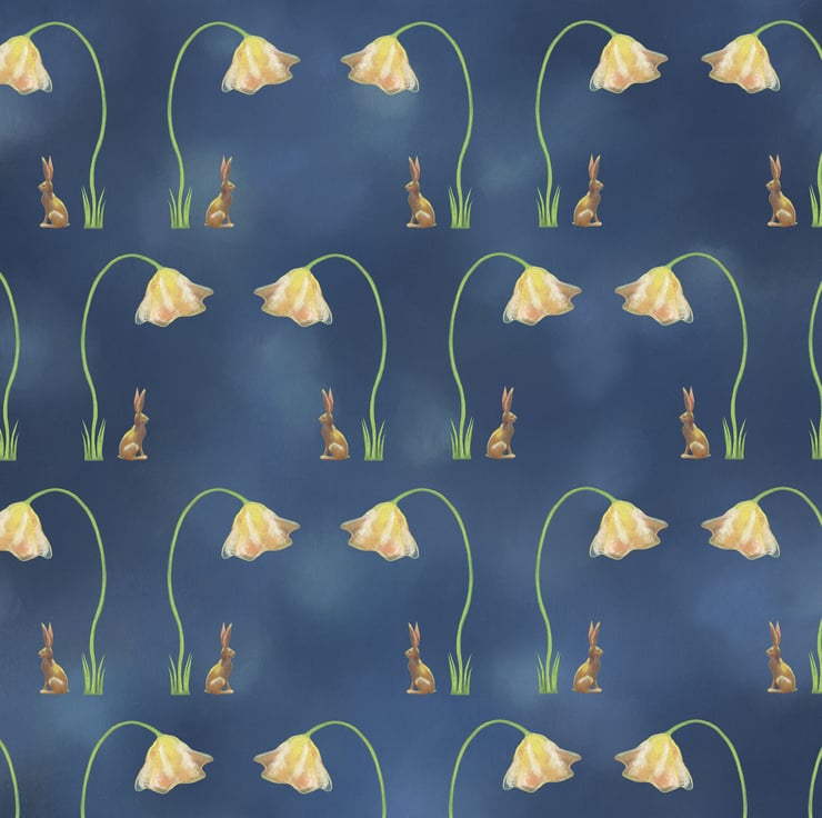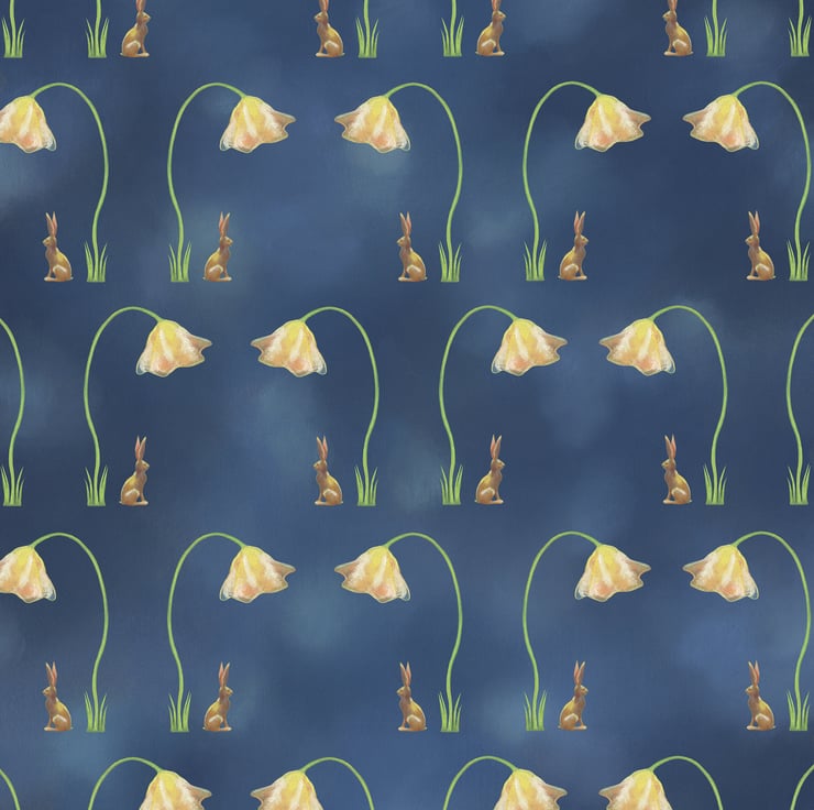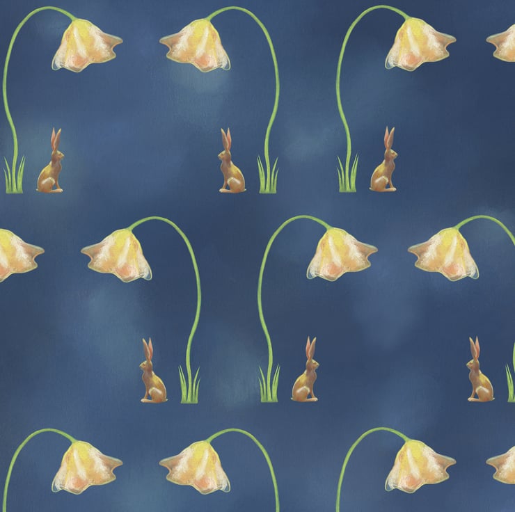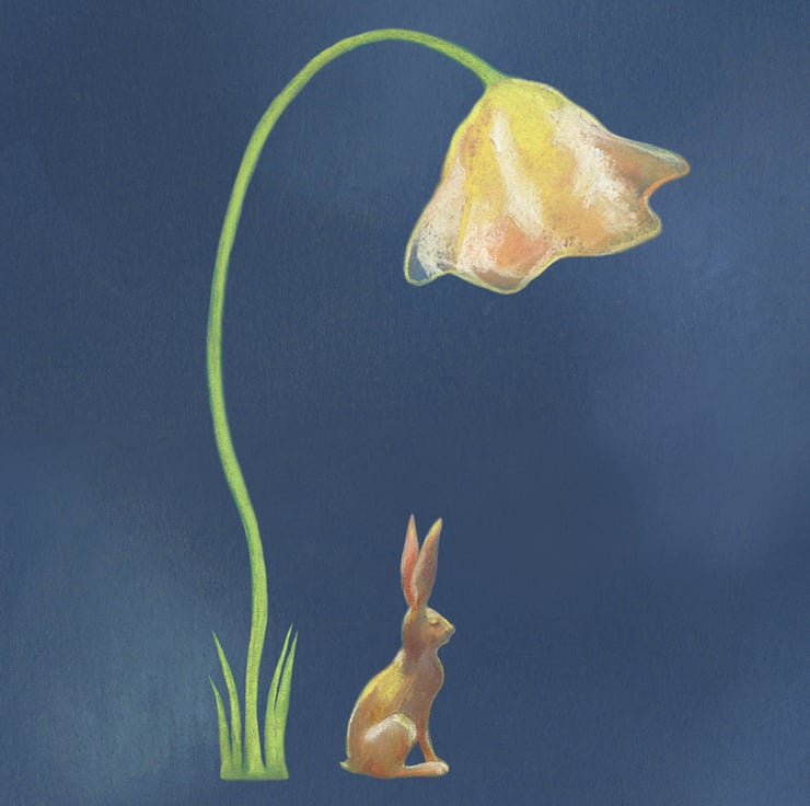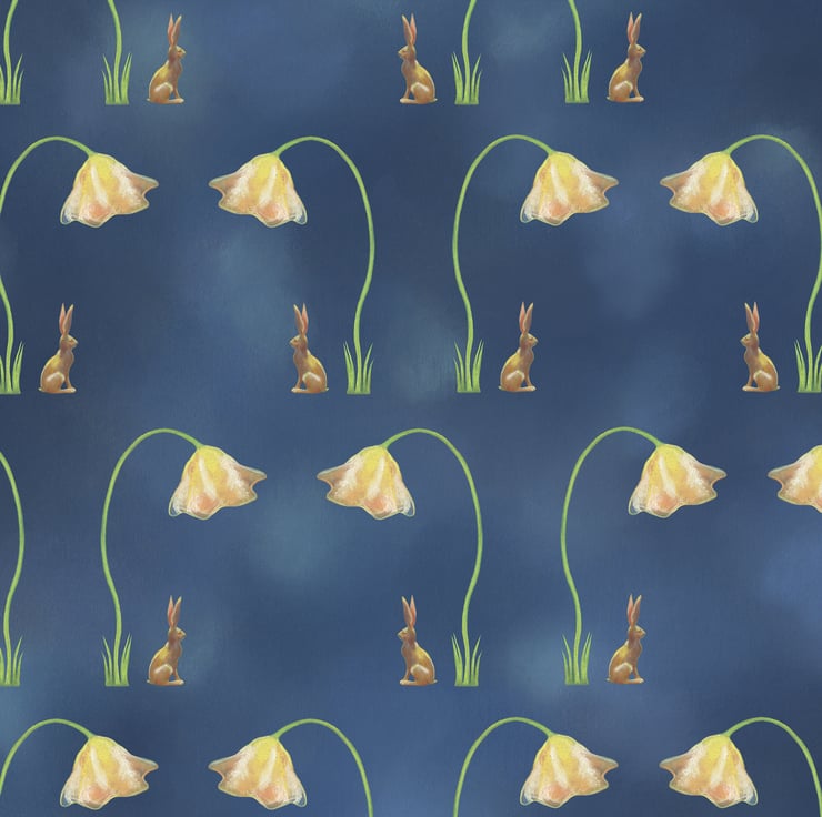 My design was created from my chalk pastel and pencil drawing of a hare sitting under a flower and is titled "By the Light of a Flower"!