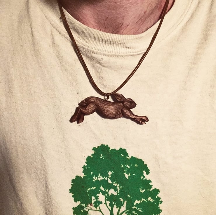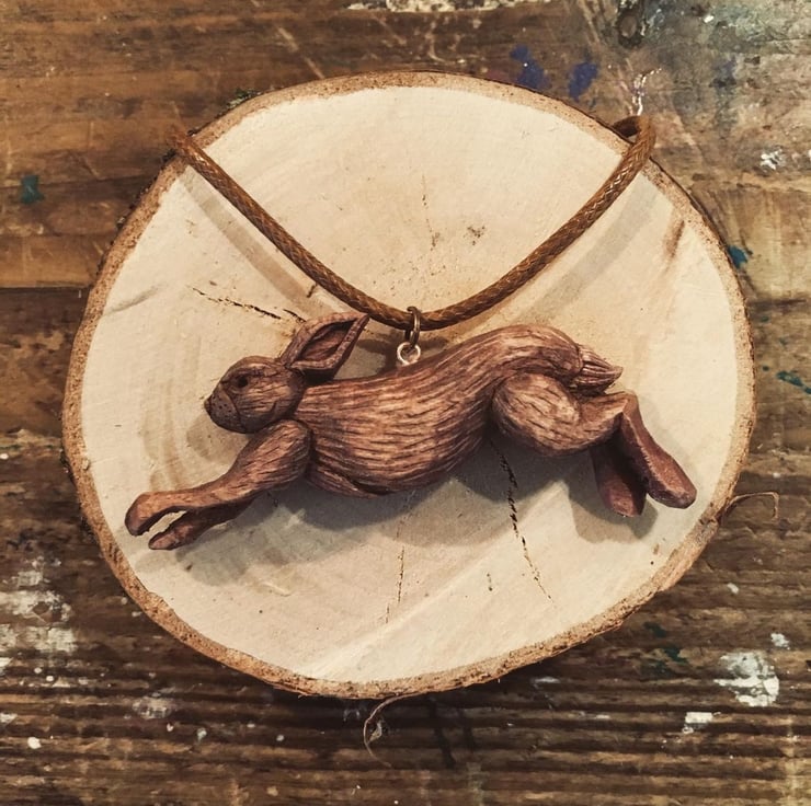 A hand carved leaping hare pendant on a brown wax cord necklace.