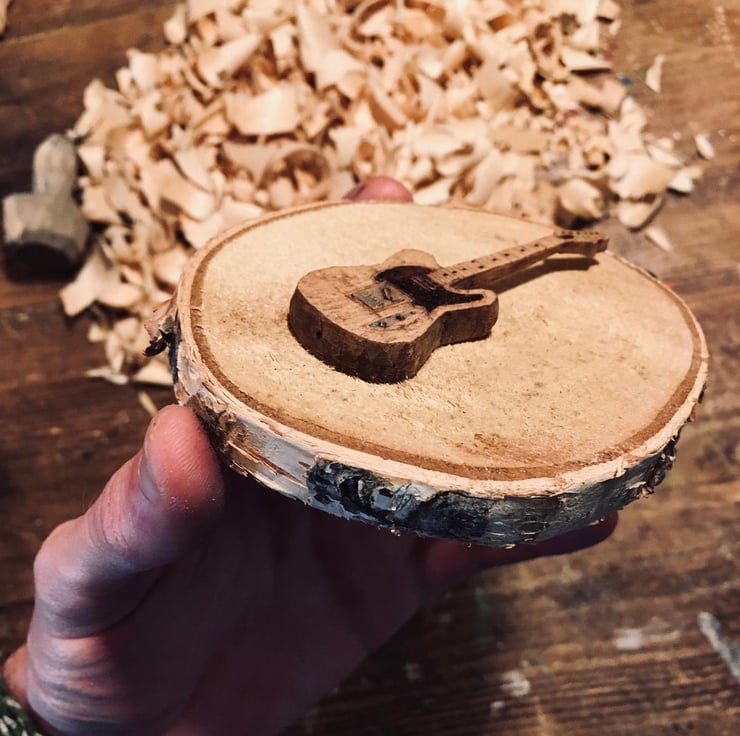 A hand carved tiny telecaster style guitar, mounted onto a beautiful slice of silver birch wood that can be hung up in your home.