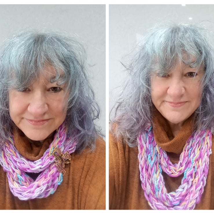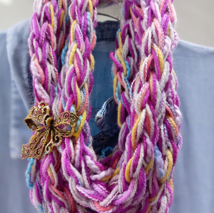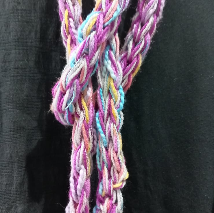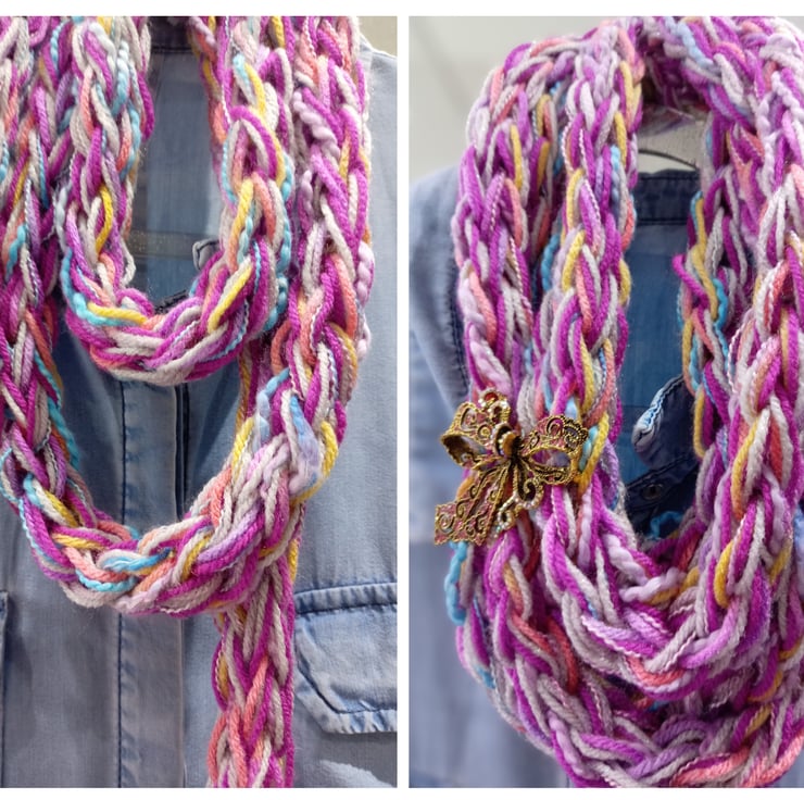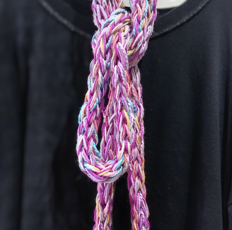 This is a very long infinity scarf which has been knitted using the fingers as opposed to needles.