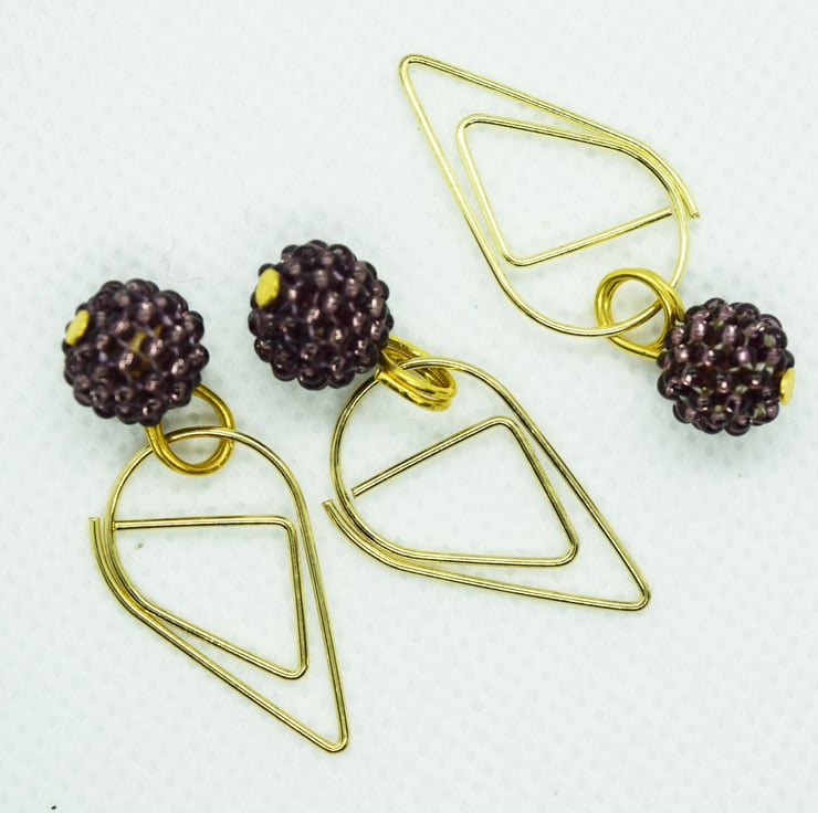The beaded beads are made by hand weaving tiny glass seed beads around a 6 mm wooden core bead. Each bead bead measures 10 mm (1 cm). They are then threaded onto a gold headpin which is formed into a loop so that the bead dangles from the curved end of the teardrop paperclip.