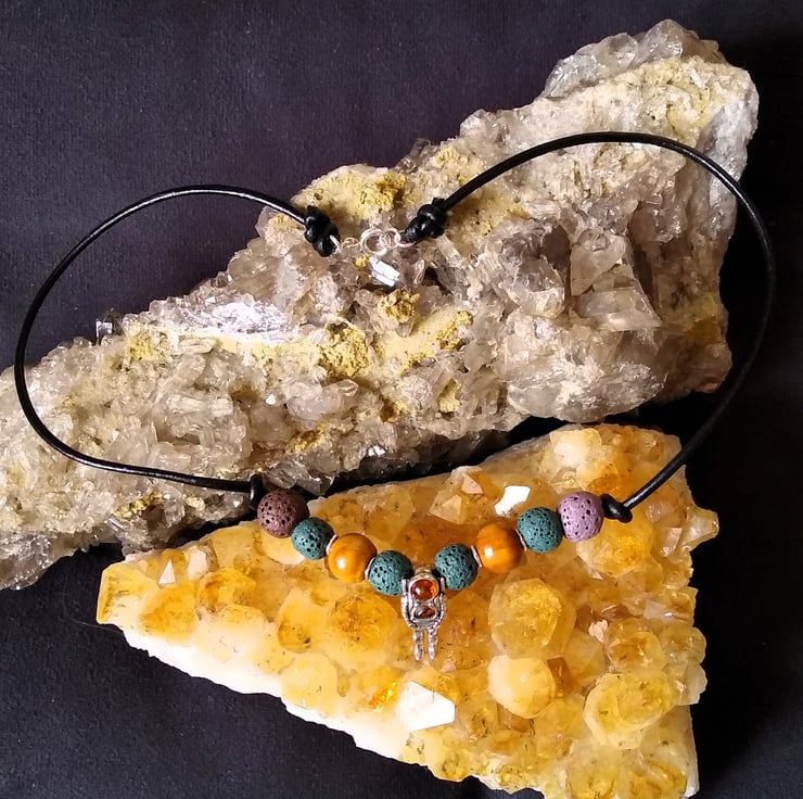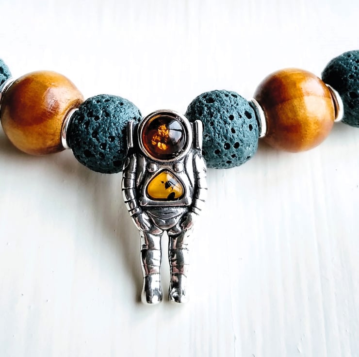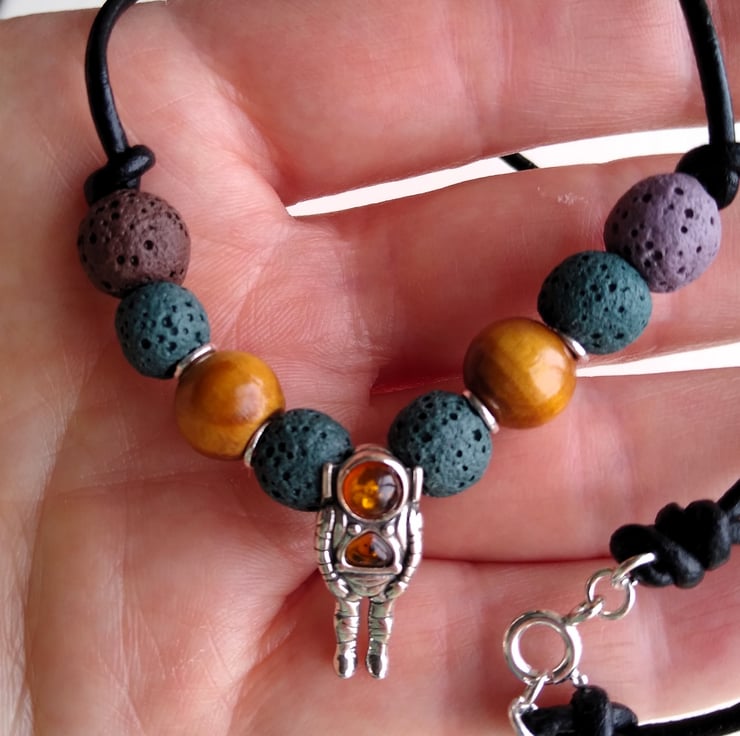 A genuine Baltic Amber and 925 Sterling Silver spaceman pendant with lava rock and wood beads on real black leather cord, finished with a sterling silver bolt ring clasp. Length 17 inch approx.