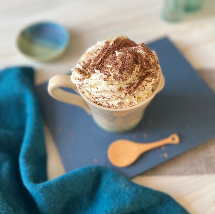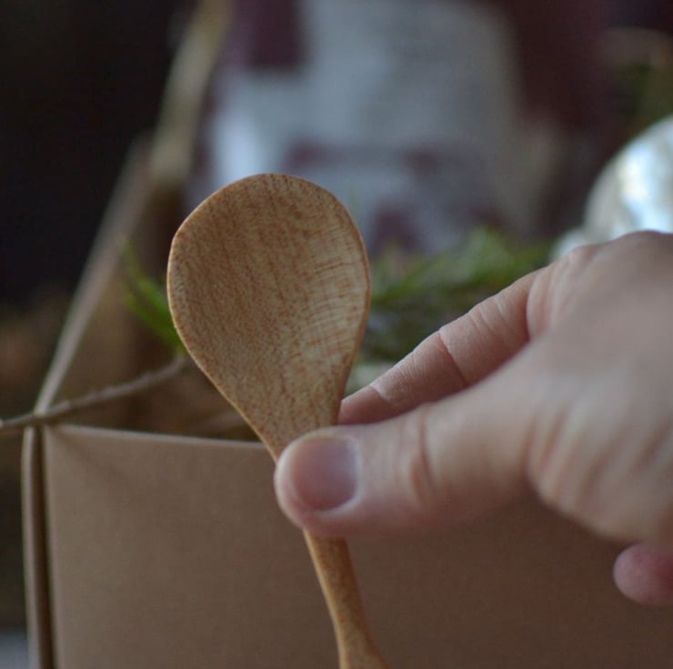 A beautiful handmade ceramic mug with a space to hold a handmade wooden spoon with heart detail.