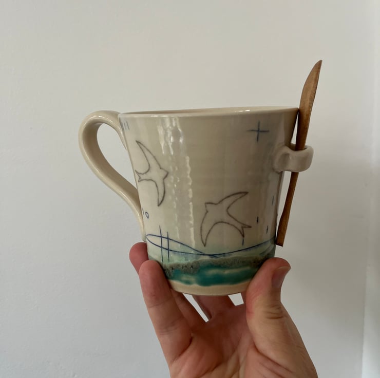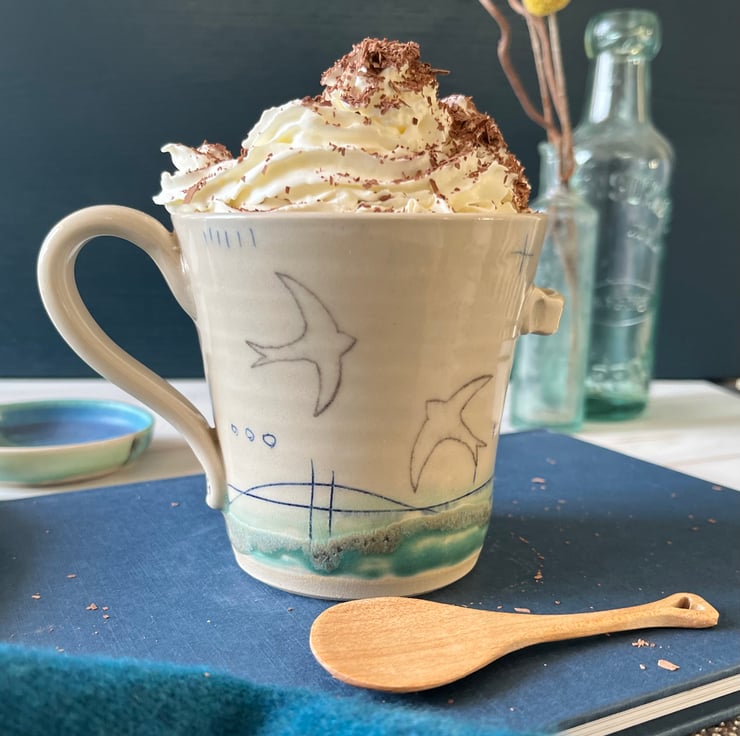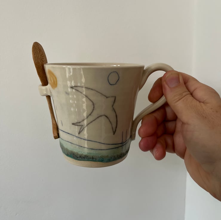 This hot chocolate mug forms part of my Swift Mustard moon range - The swift is associated with change, travel and communication. Swifts can also be signs of new beginnings.