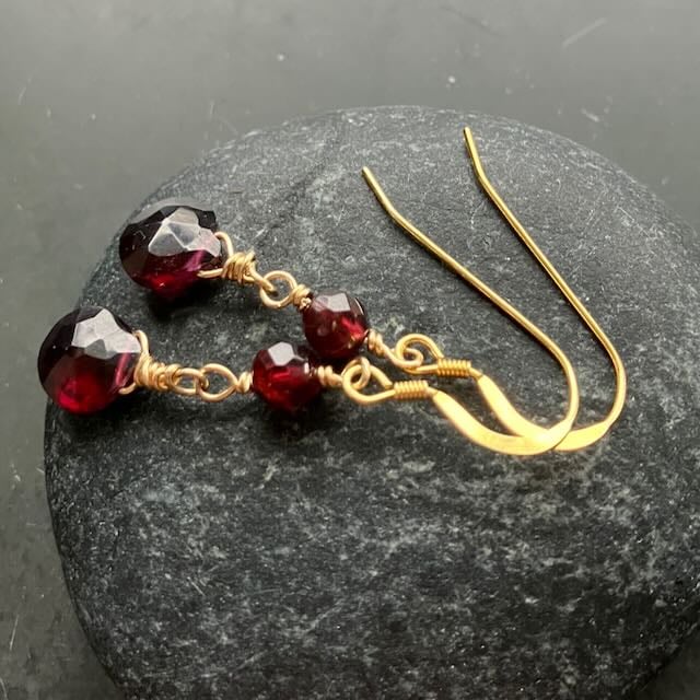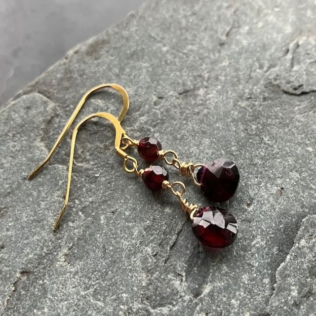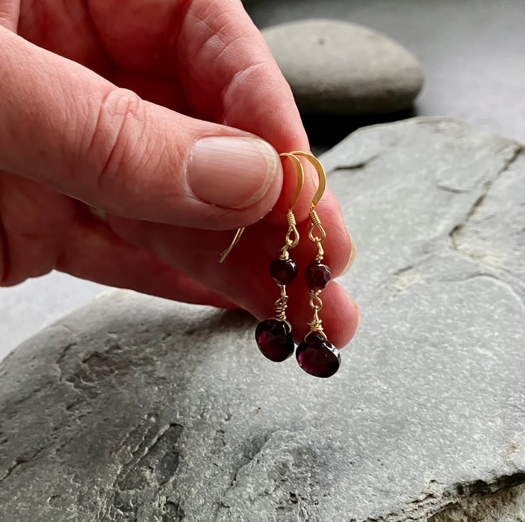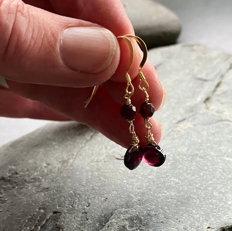 These delicate drop earrings have a deep red garnet briolette and a facetted garnet bead at the top. The gold complements the rich red perfectly. They are light and easy to wear with lots of movement so they twinkle as you move. The drop measures approximately 3cm from the bottom of the hook.