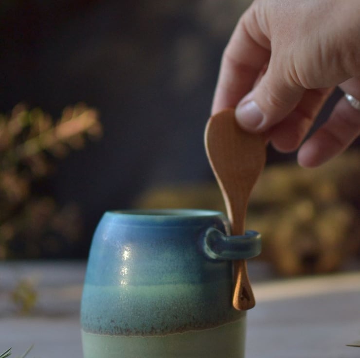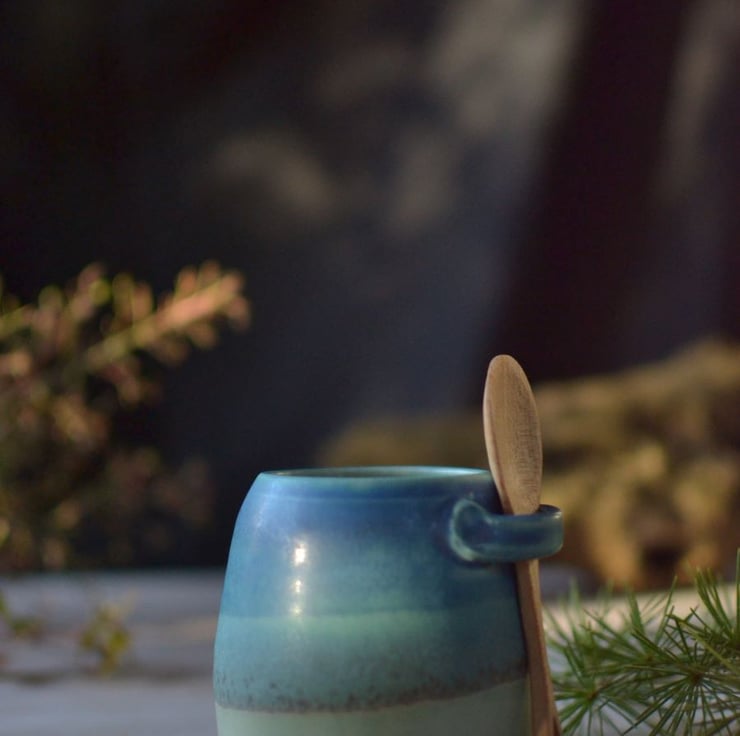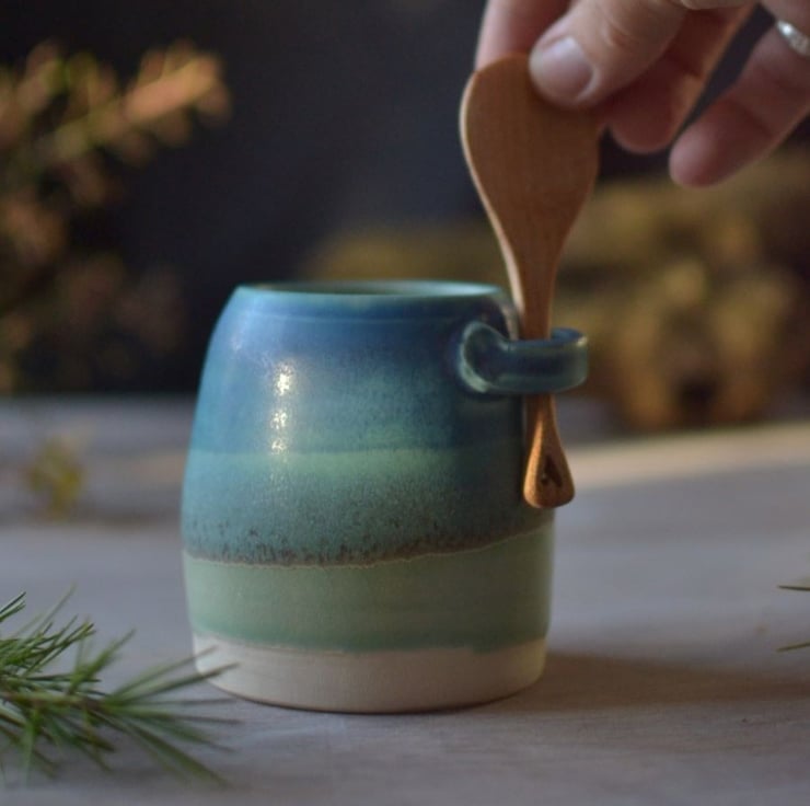 The sugar bowl have been made from natural materials using as few resources as possible. With a mix of green and turquoise glazes, it has a simple, undulating design that reflects the patterns of the ocean and sea shore. It comes with a beautiful handmade wooden spoon. This item forms part of my Skyline collection of handmade pottery.