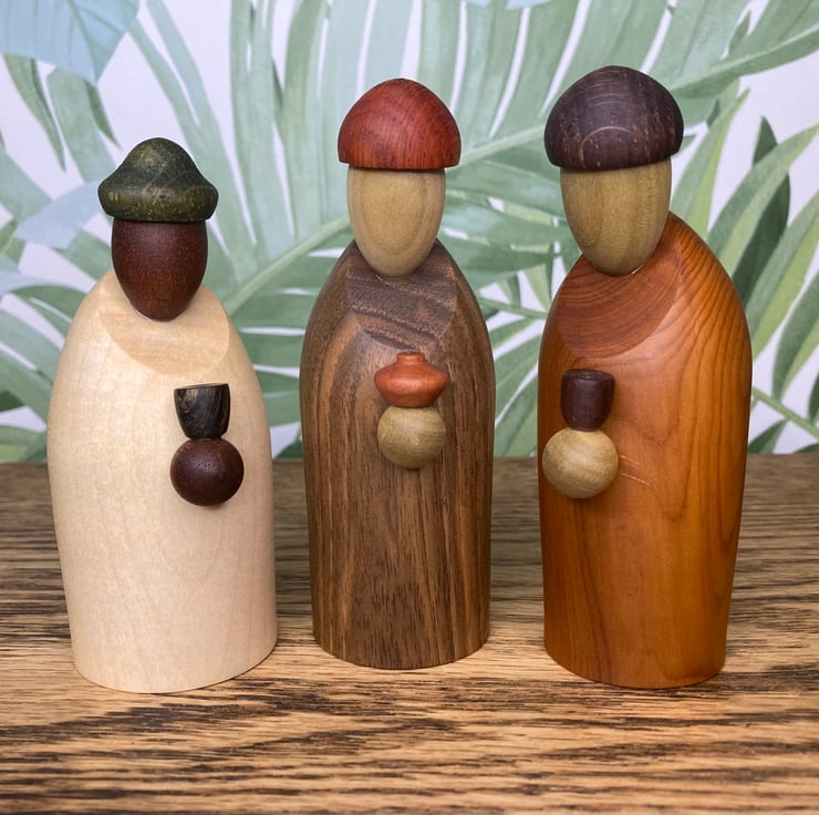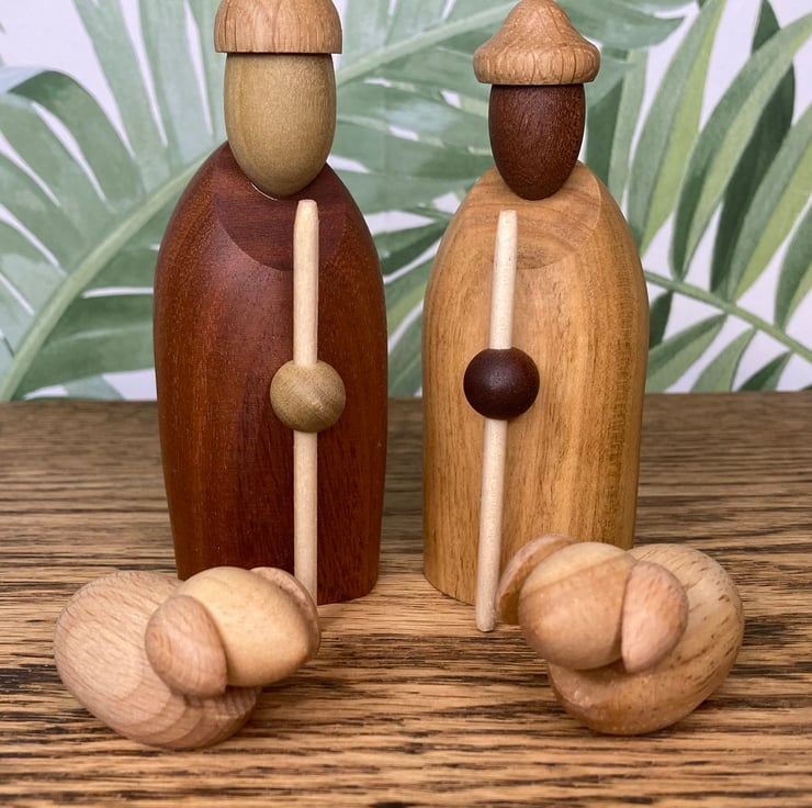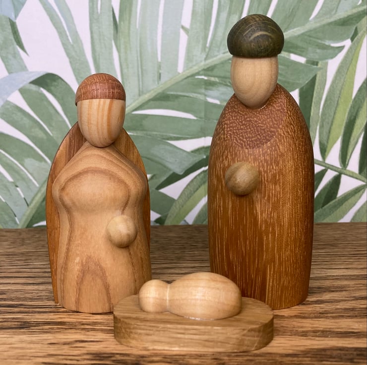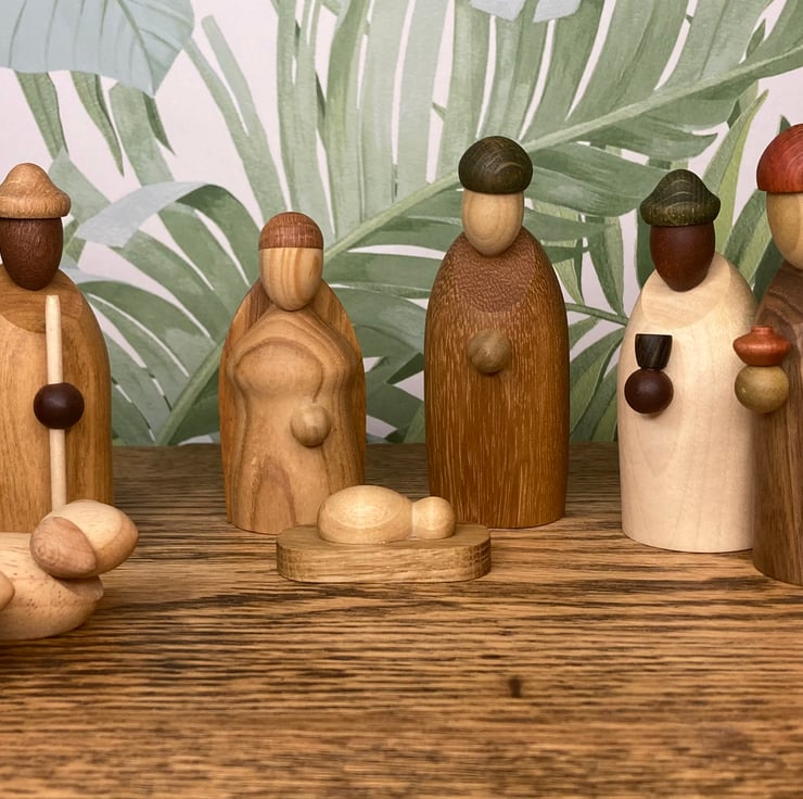 Handmade on our woodturning lathe, this nativity set is made from a number of different timbers along with some dyed elements. Each component is turned using various methods including split turning.