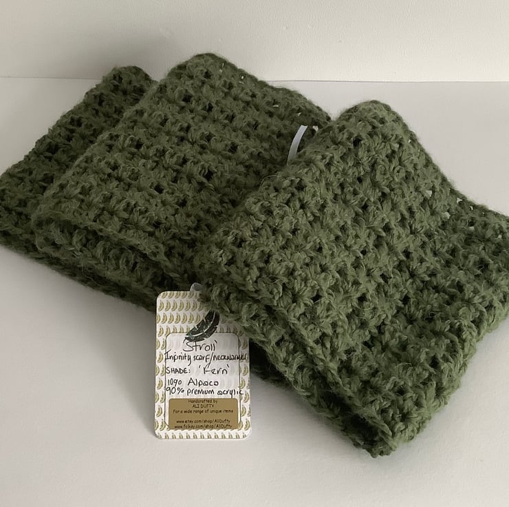 I have designed and crocheted this double-wrap infinity scarf / neck-warmer 'Stroll' in a soft, lightweight ,alpaca blend yarn. An ' endless loop' that can than can be worn as is or wrapped twice ! ( 1st / main picture shows 2 wraps ) .