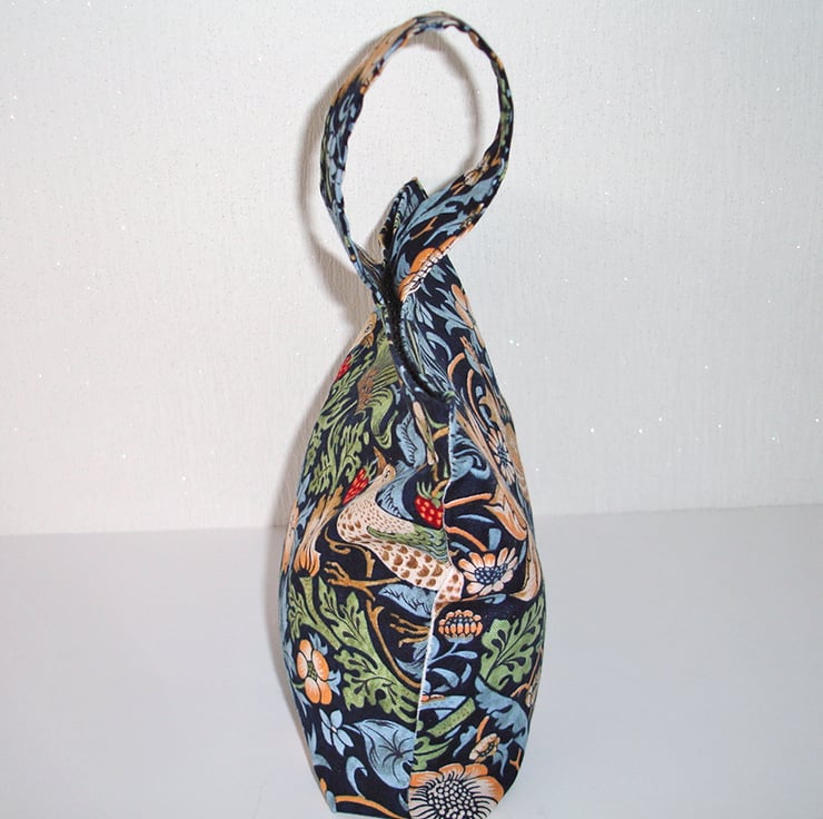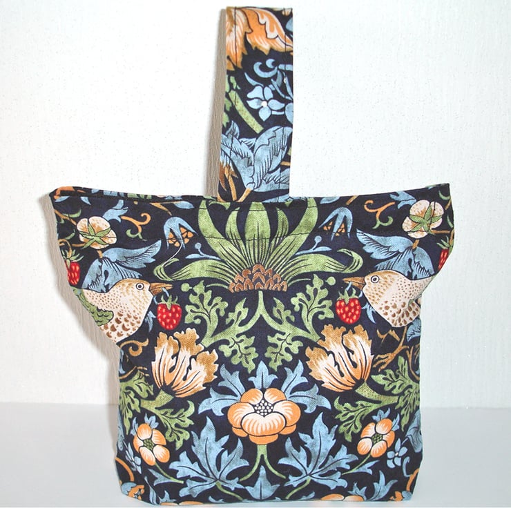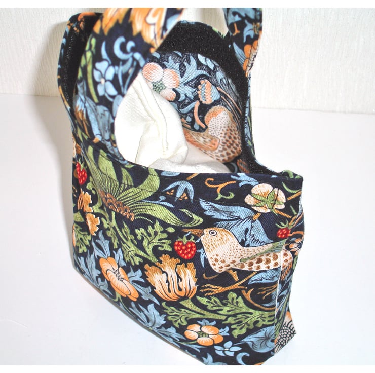 A beautiful Liberty of London Arts and Crafts Movement fabric in the William Morris Design The Strawberry Thief - Colour Palate - Dark Blue / Red / Beige / Green. Perfect for travel or a small lumbar nursery pillow. The back of this pillow cover is in a plain black cotton fabric.