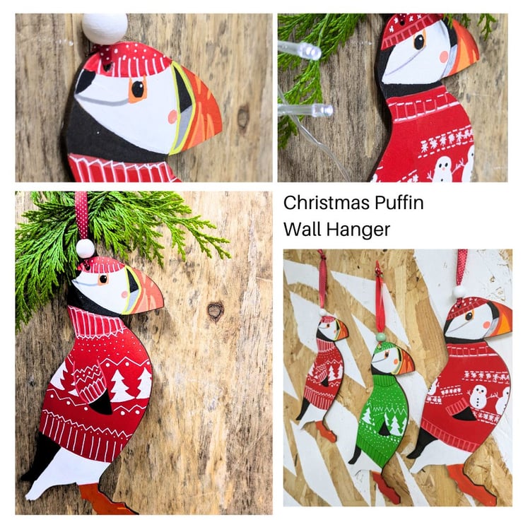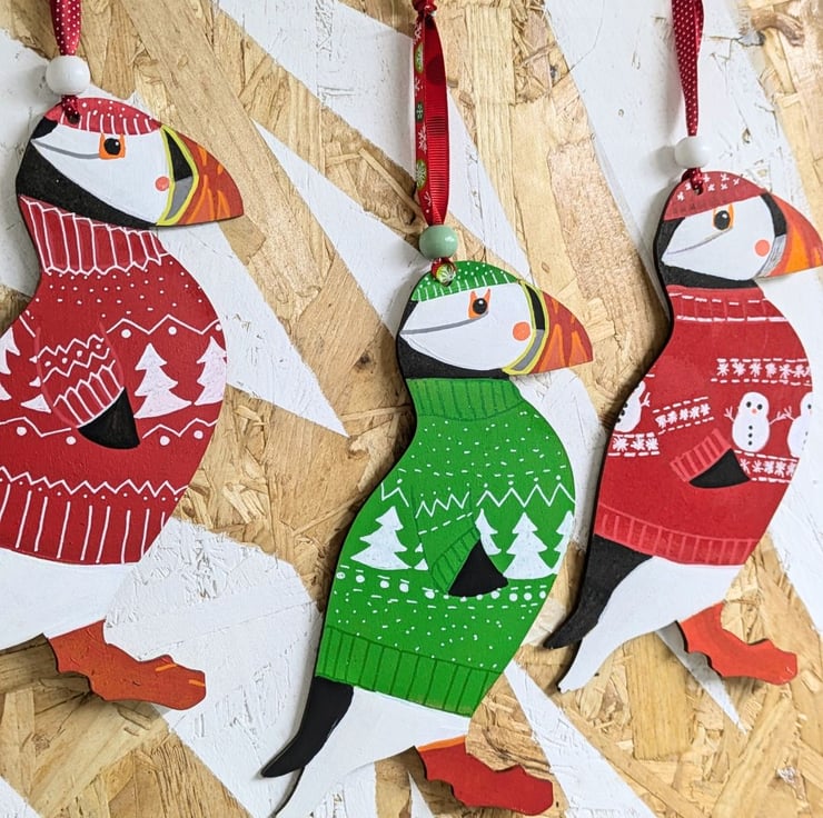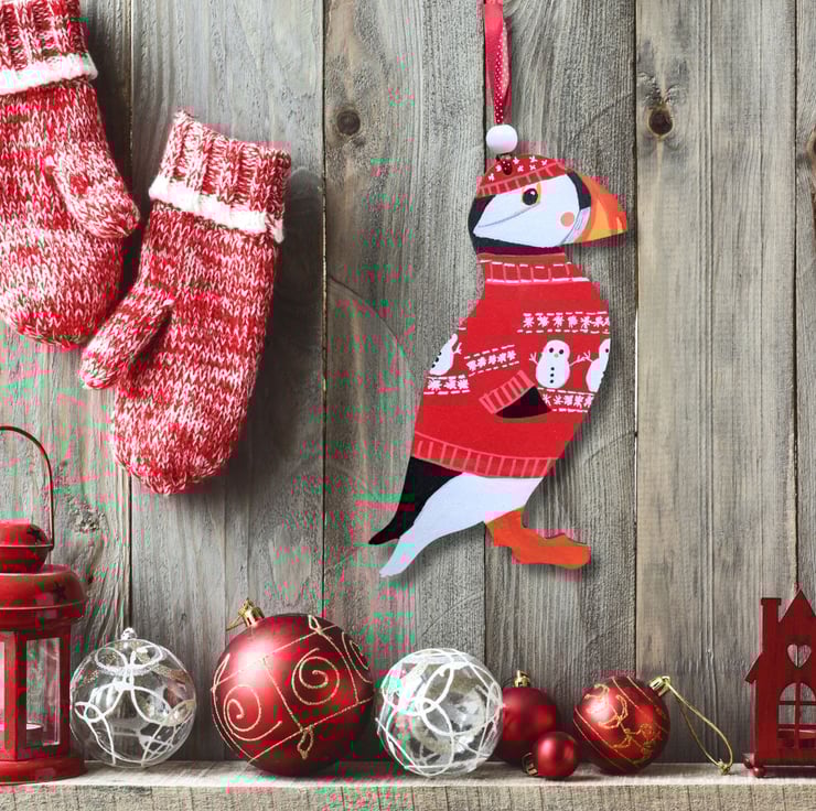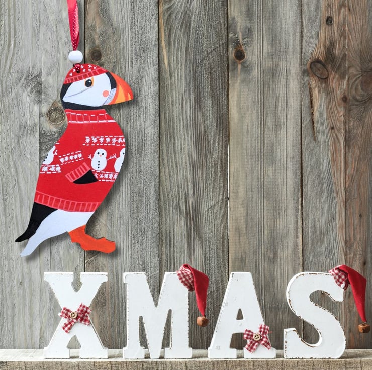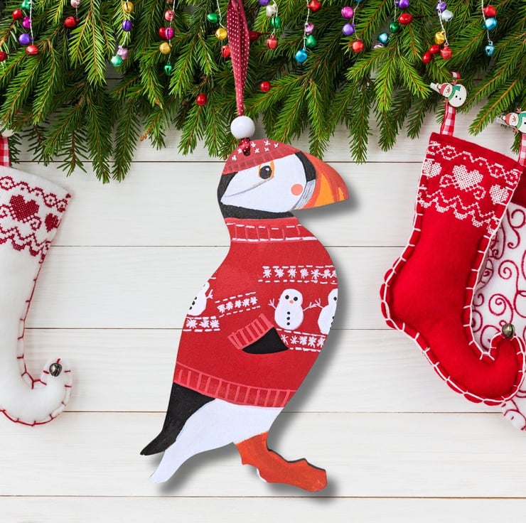 Hand painted puffin in his favourite christmas jumper. With a red ribbon ready to hang on a wall, door handle and much more. Would also make a fabulous secret Santa or little gift.