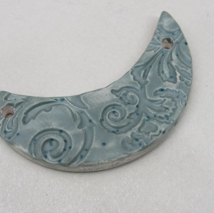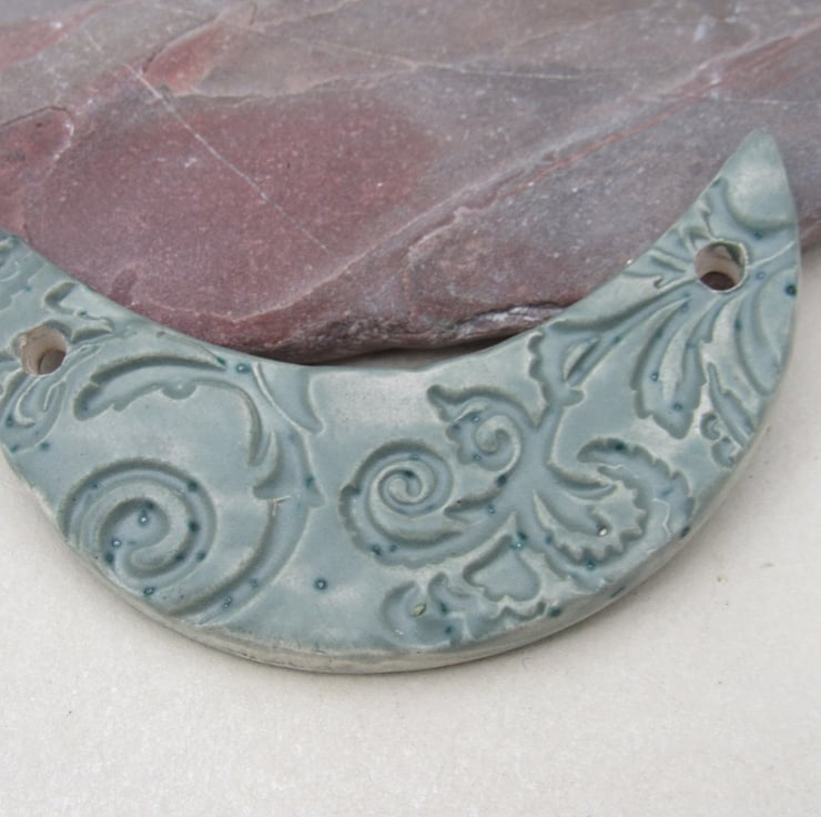 Sage green ceramic bib pendant patterned with textured leaves and flowers