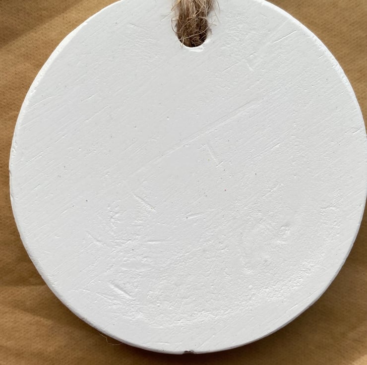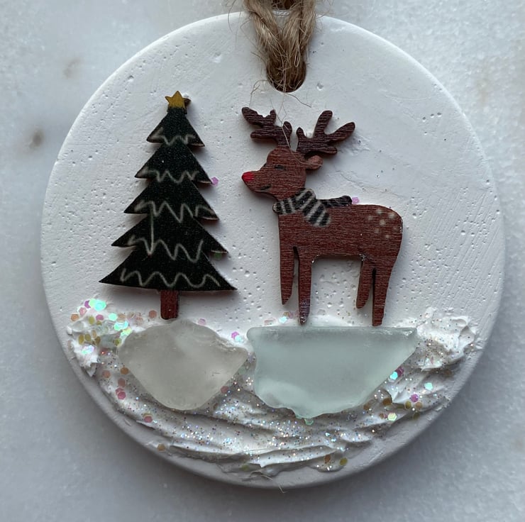 Unglazed ceramic disc decorated with wood embellishments and sea glass from the beaches of Cornwall. Finished with glitter and a bell.