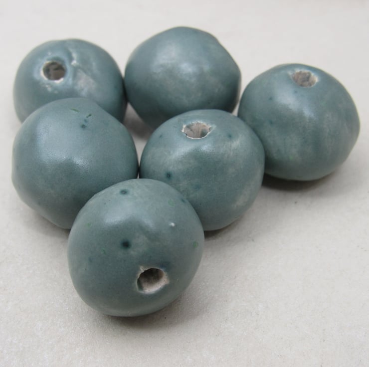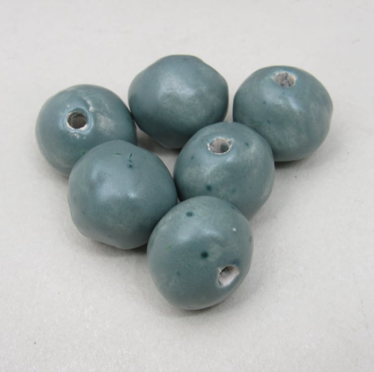 A mixture of handrolled ceramic beads, finished with a soft, matte, sage green glaze