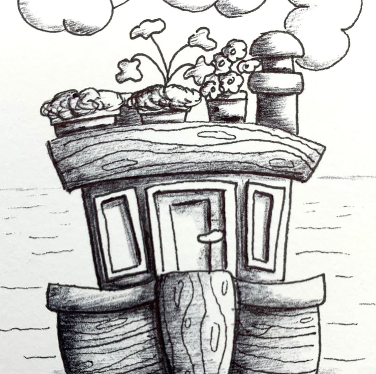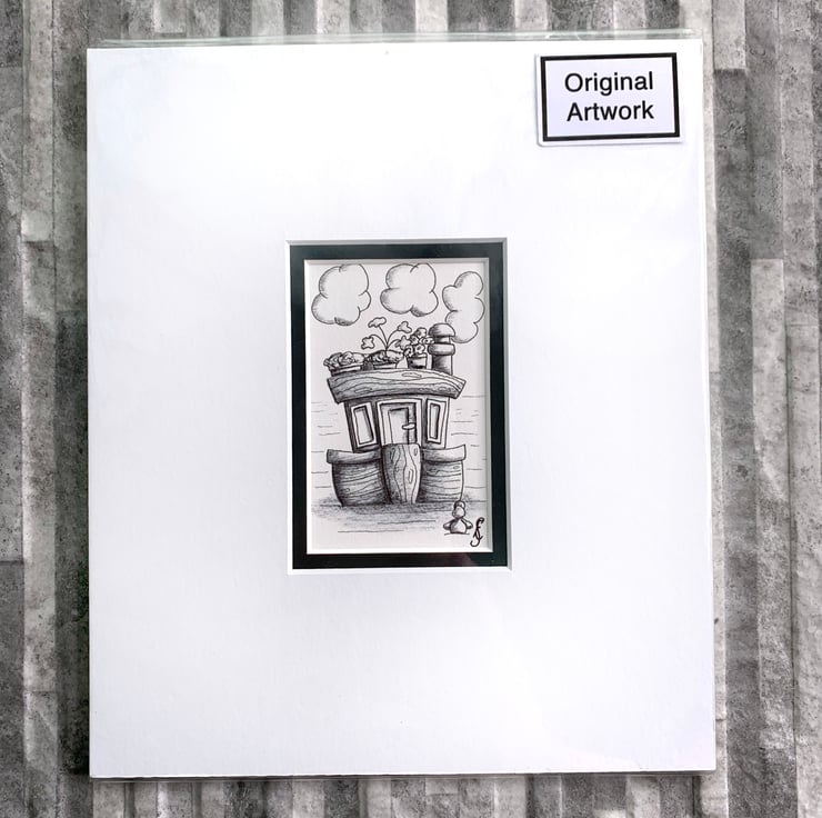 Mini Canal Boat pen and ink illustration Double mounted and ready to frame. (No. 37)