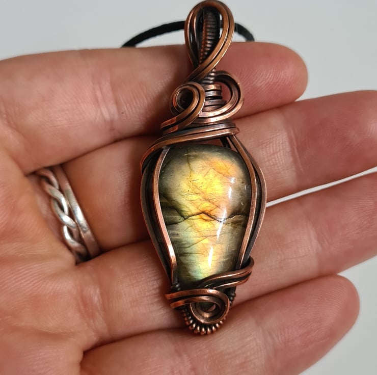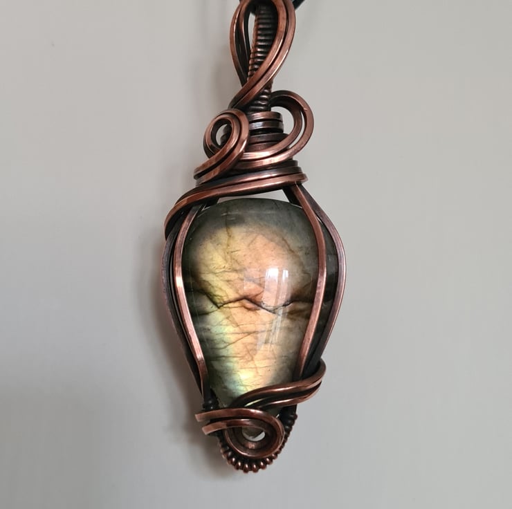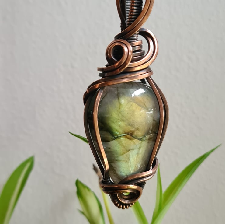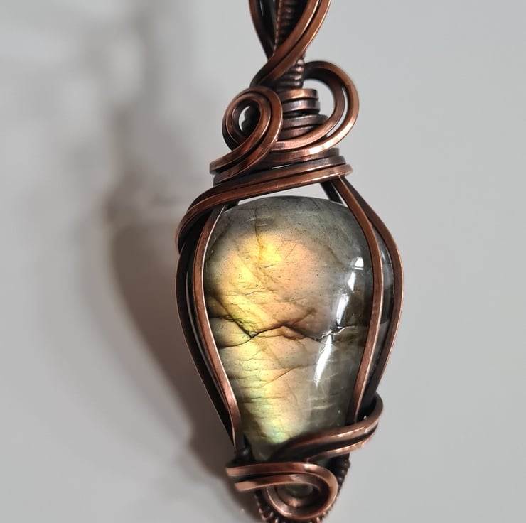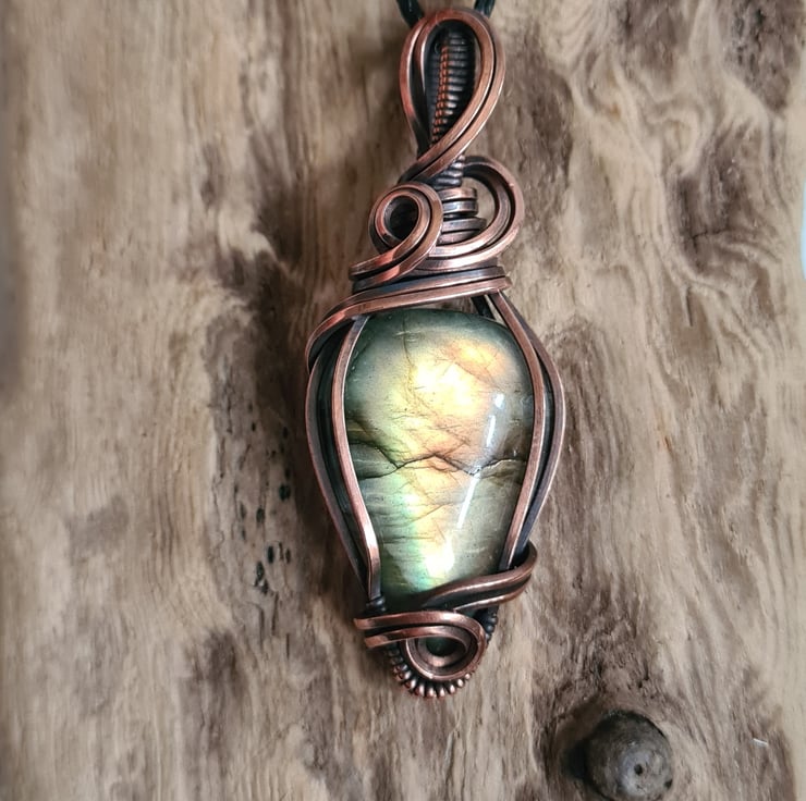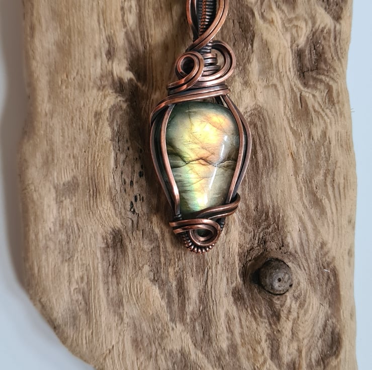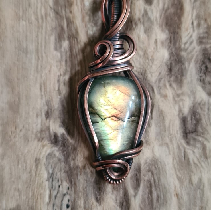 This lovely golden/green/yellow Natural Labradorite stone is such a beautiful colour and looks great teamed with the antiqued copper. Really is absolutely stunning and has so much flash to the crystal.