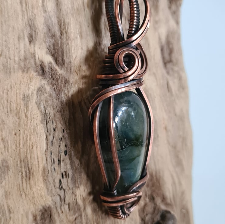 I have wrapped this beautiful stone with copper into this unique design, and then antiqued and polished for the final effect.