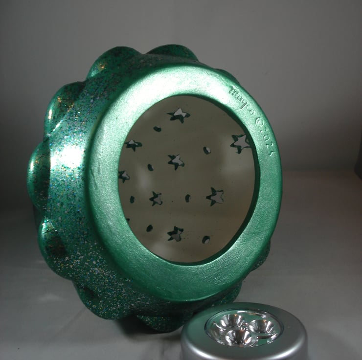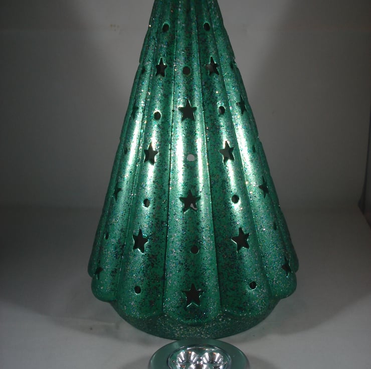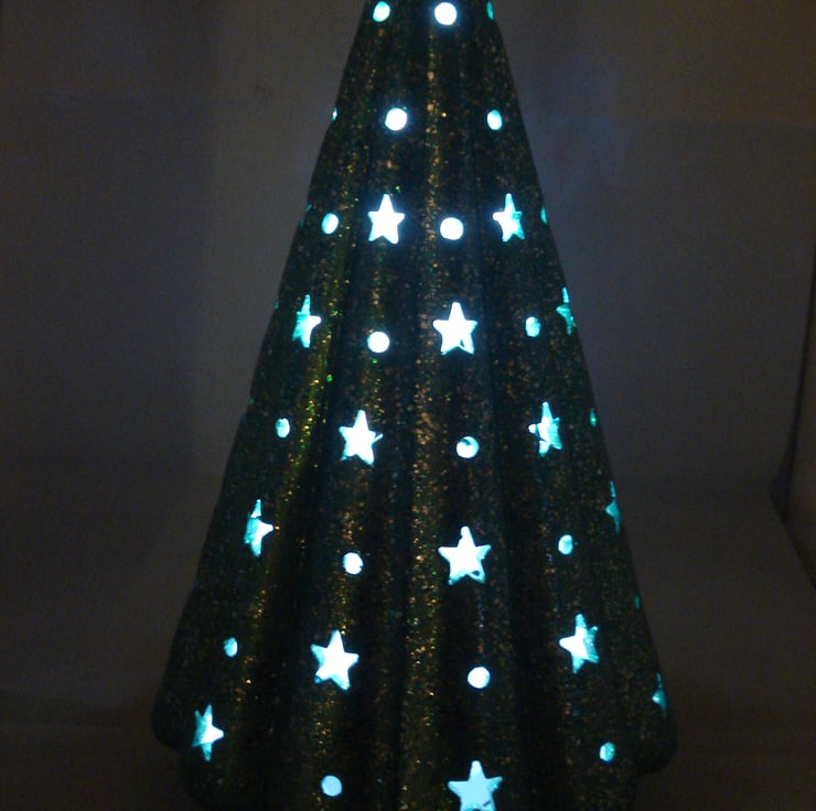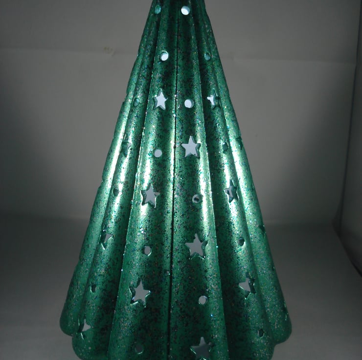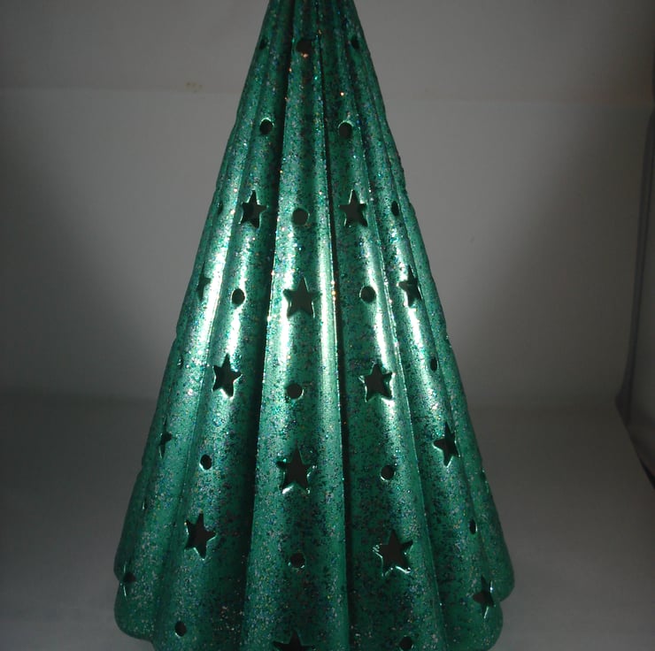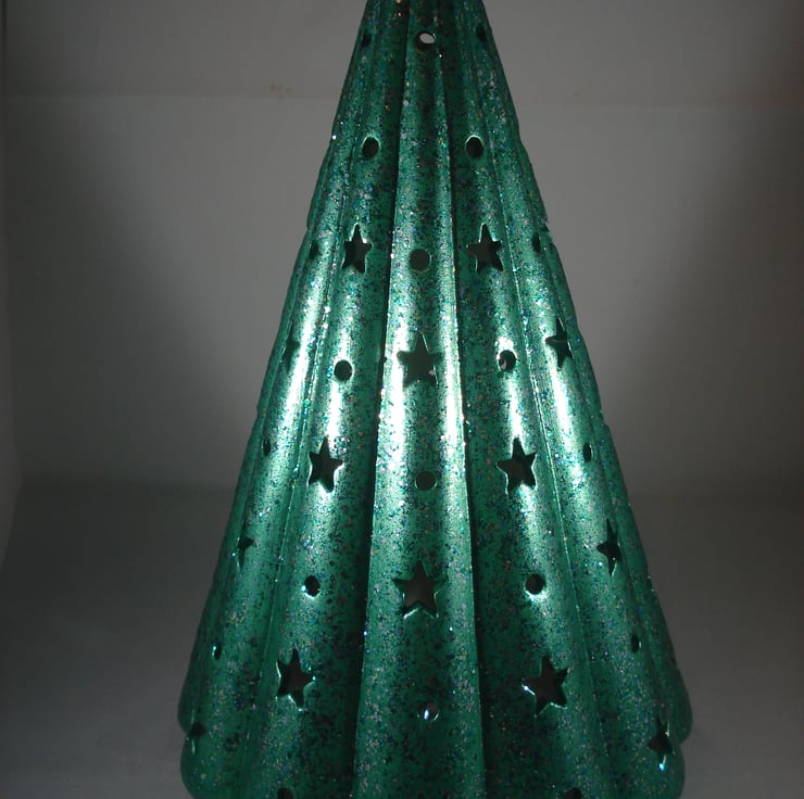 I have for sale a ceramic Christmas decoration ,which was hand painted by myself. It is a green, glittery Christmas tree, with small star cut outs all over it. The tree is hollow and included in the sale is a free battery operated L.E.D. light, which the tree stands over the top of. This would make a lovely addition to anyone's Christmas decorations, or perhaps given as a gift.