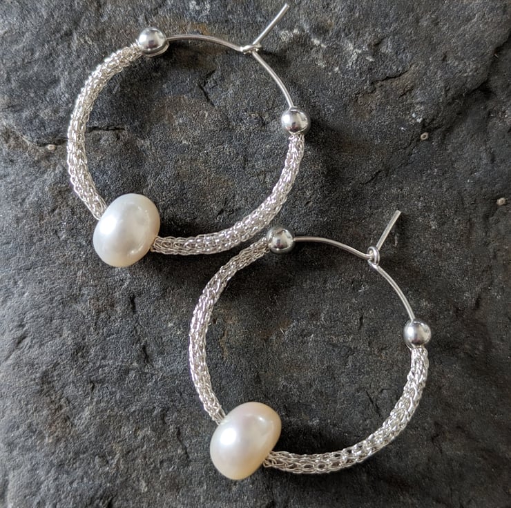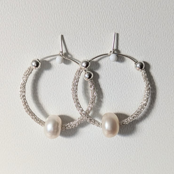 Elegantly simple hoop earrings with central freshwater cultured pearl and delicate woven fine silver thread.