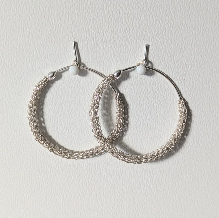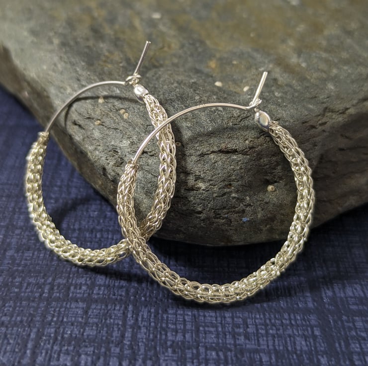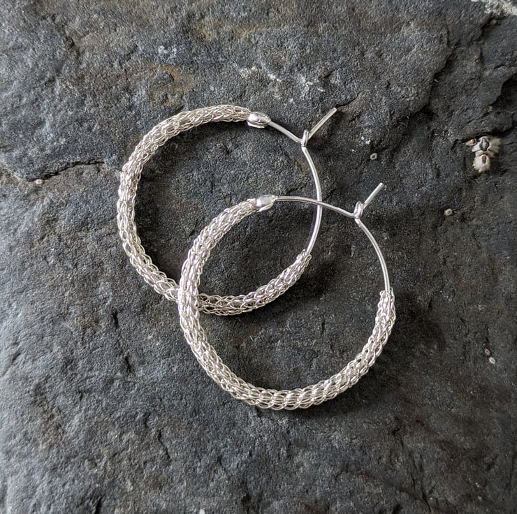Delicate woven rel silver hoop earrings, handcrafted using the traditional "viking knit" style.