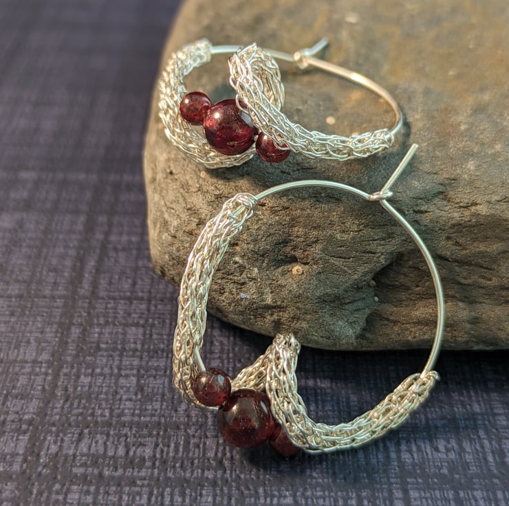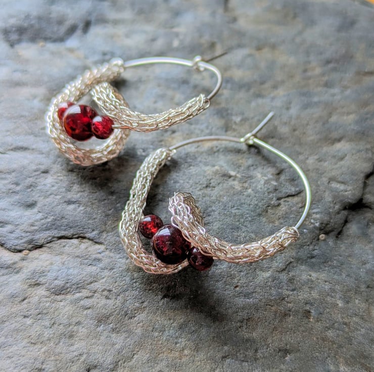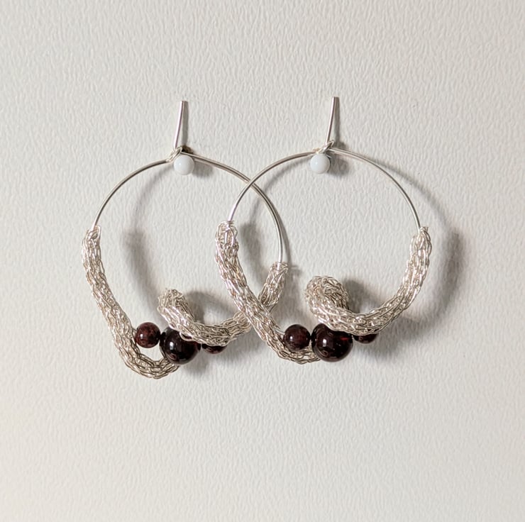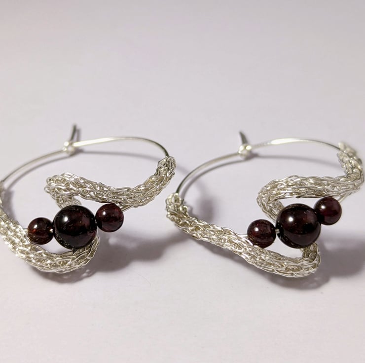Unique hoop earrings with dark red garnet gemstone beads. The wave is shaped from woven .999 fine silver and wraps around the lower circumference of the hoop, swirling around the pearl.