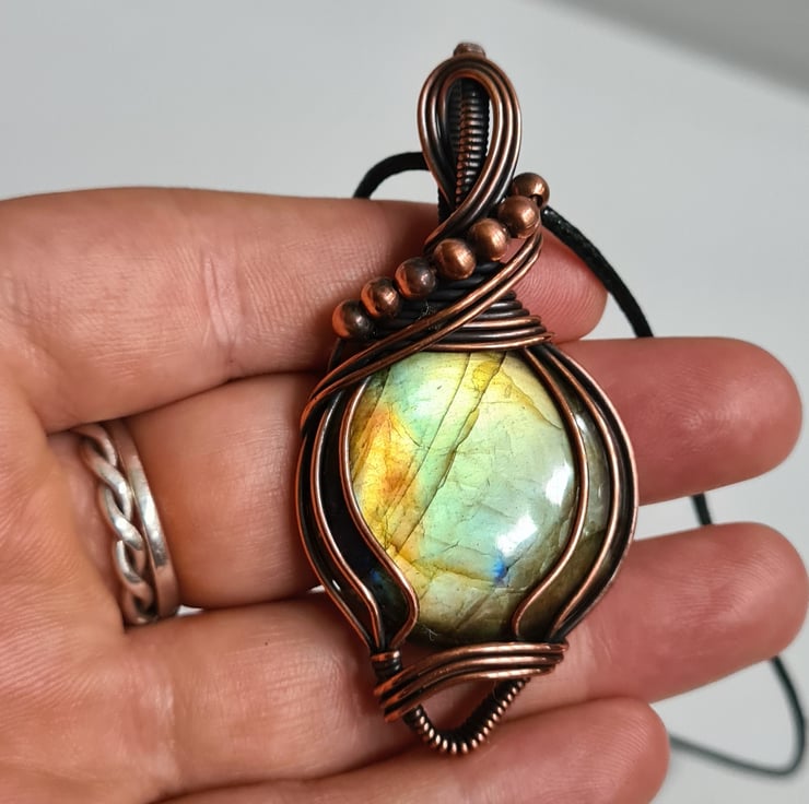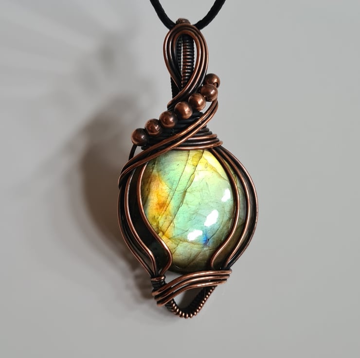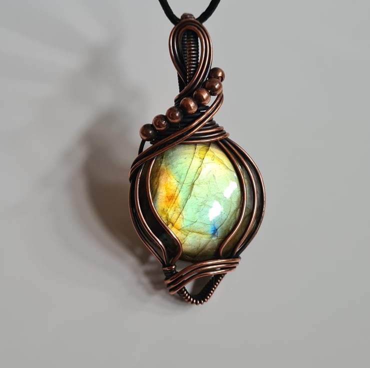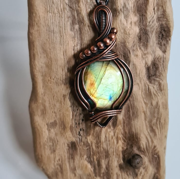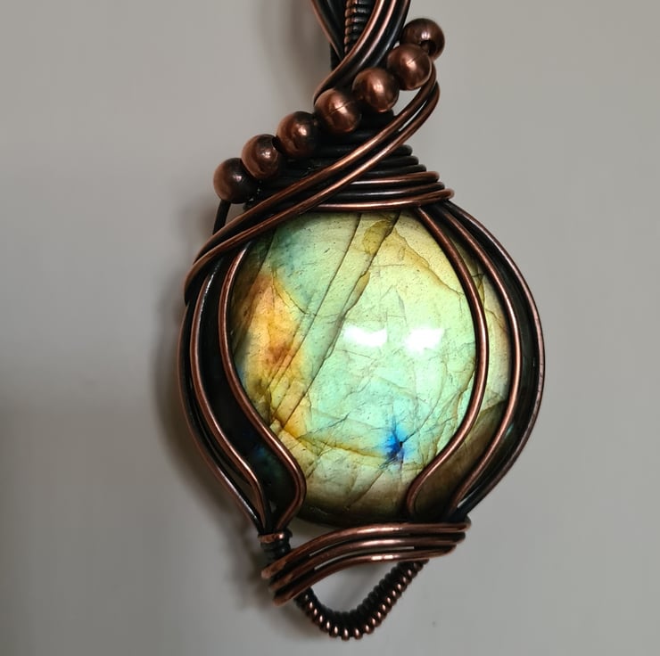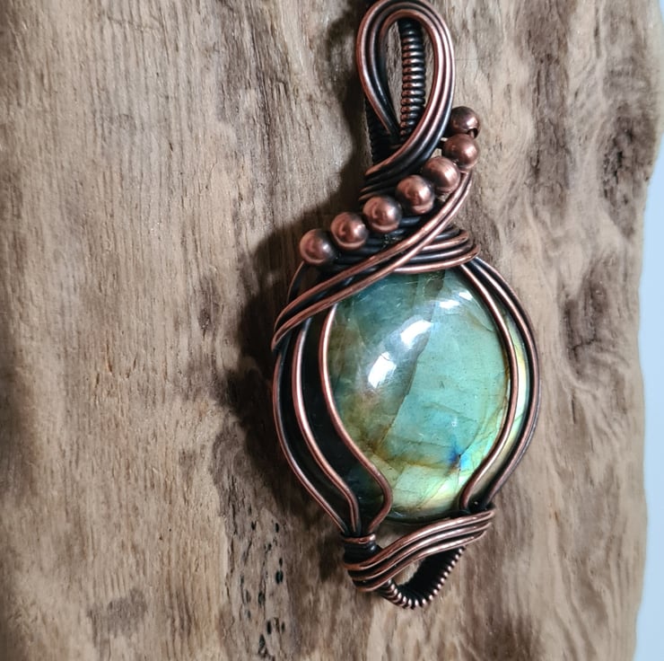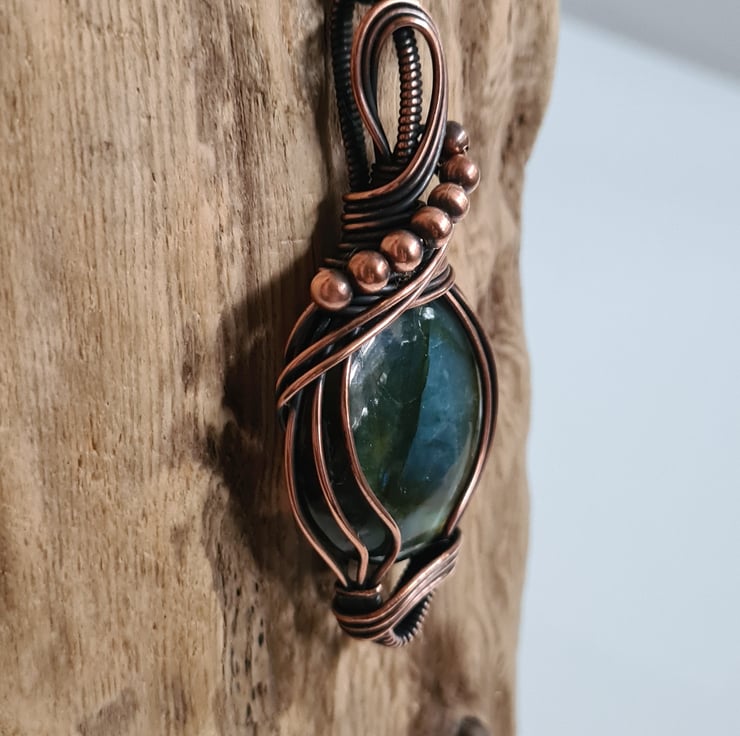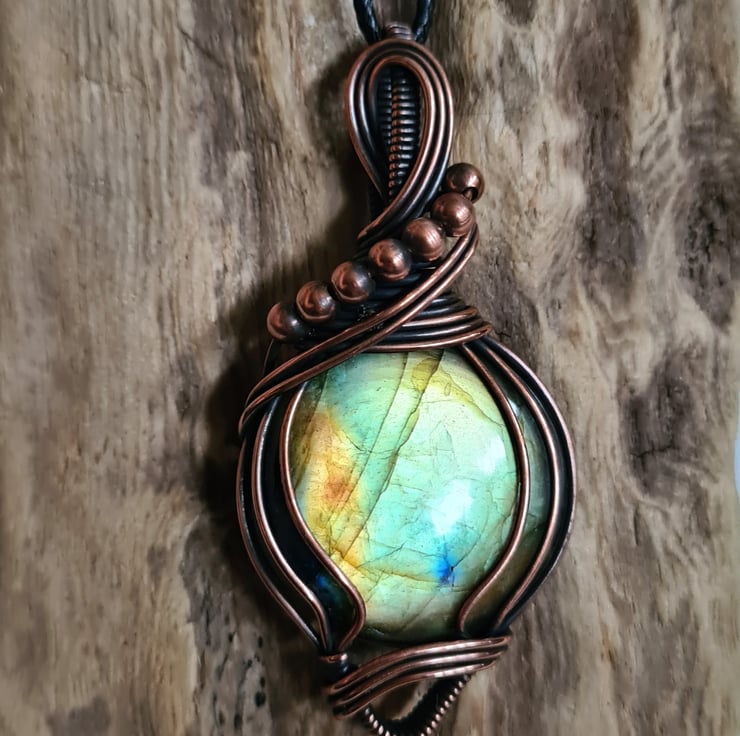 This gorgeous and large Natural Labradorite crystal is a beautiful mixed green colour and has a beautiful shimmer, shine and pattern. I have wrapped this stone with copper into this unique design and then antiqued and polished for the final effect.