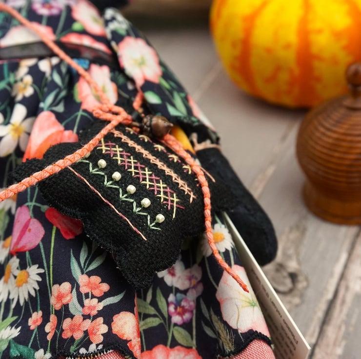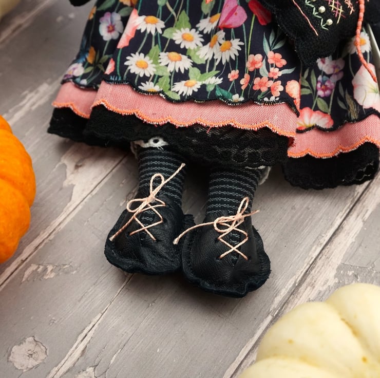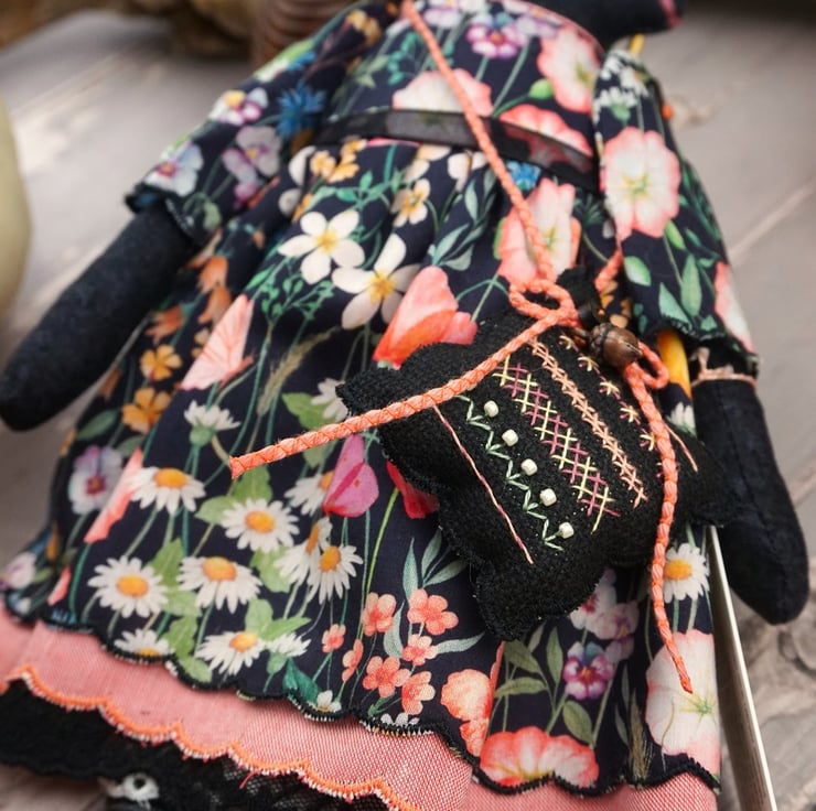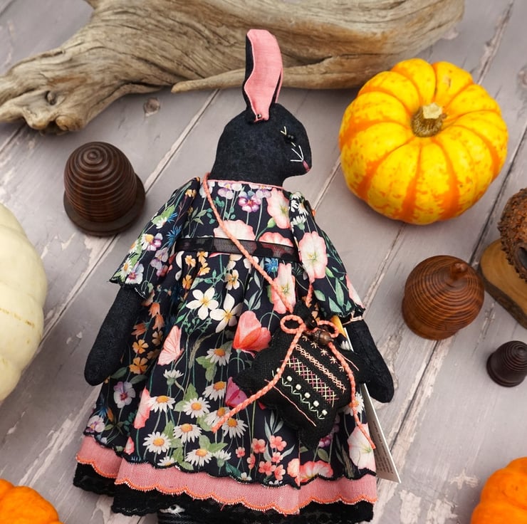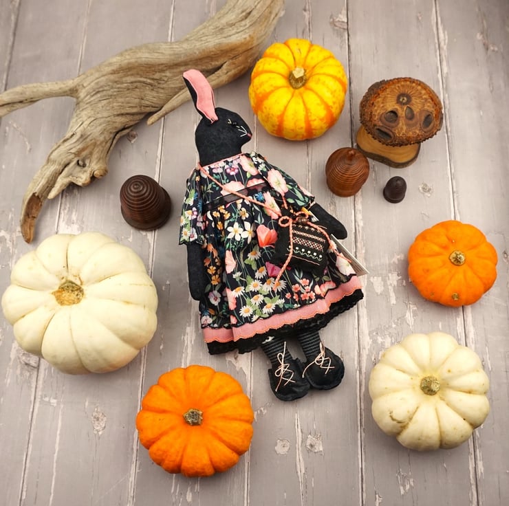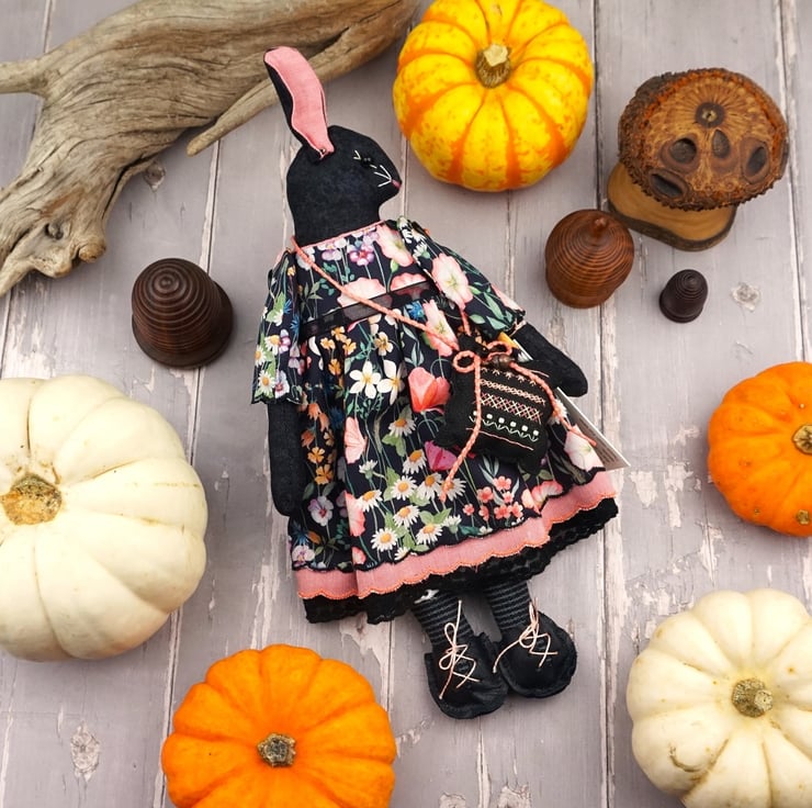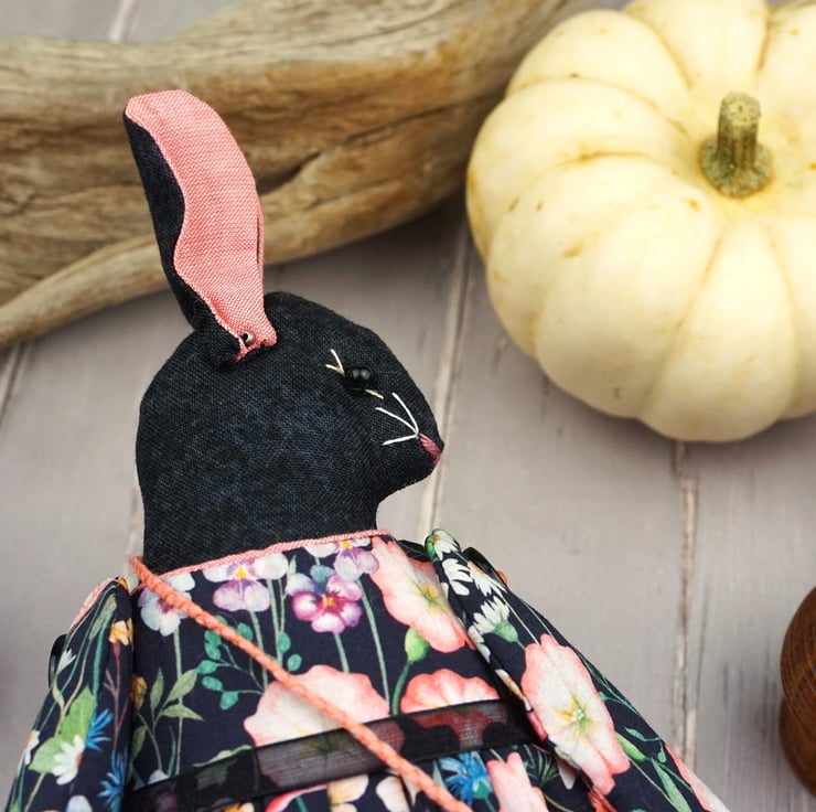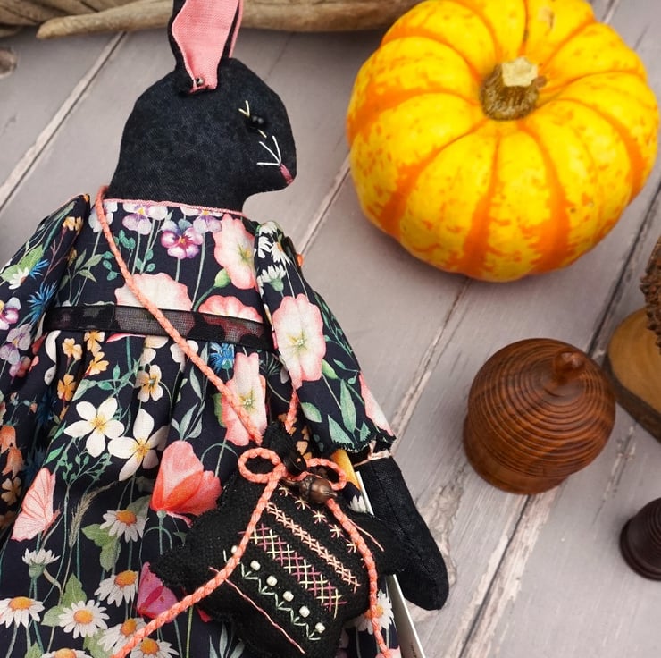 Cora is a tiny midnight bunny lady dressed in a lovely Liberty Lawn called Jude's Garden, a black ground with a floral garden running across the fabric. She has rosemary in her stuffing with a carnelain crystal to her heart, hand embroidered features and a little pompom tail. She is finished with tiny buttons, organza ribbon and little black leather shoes.