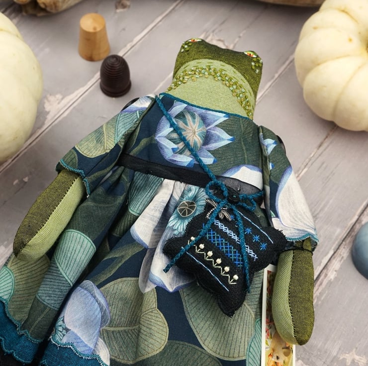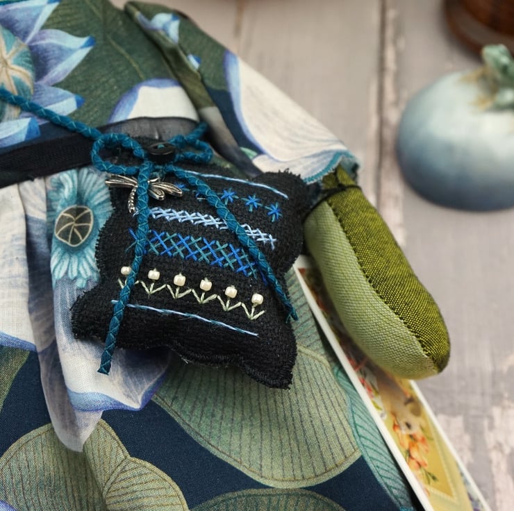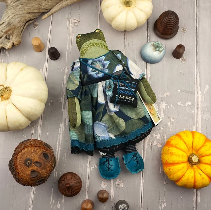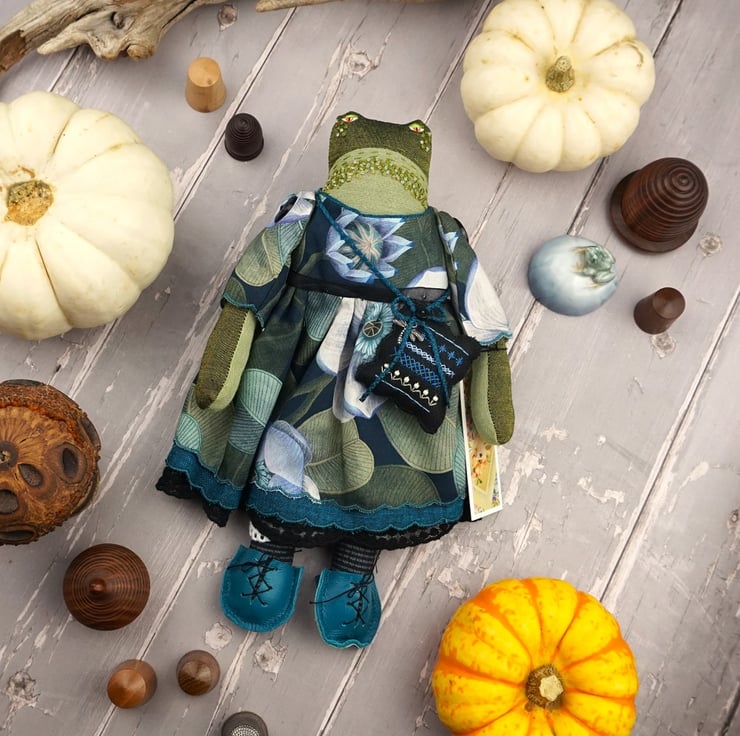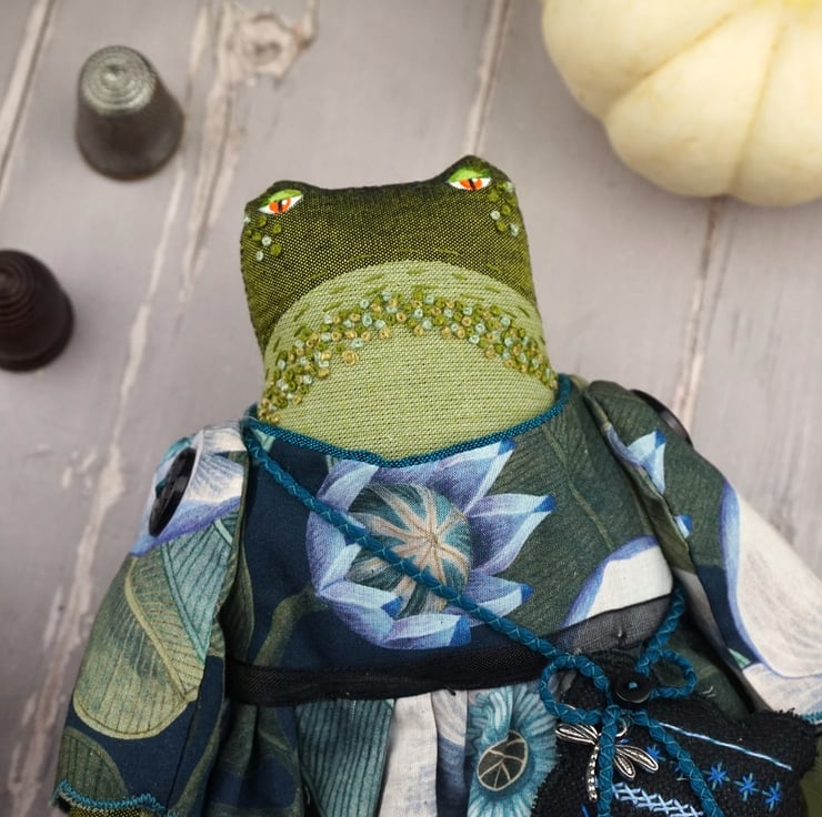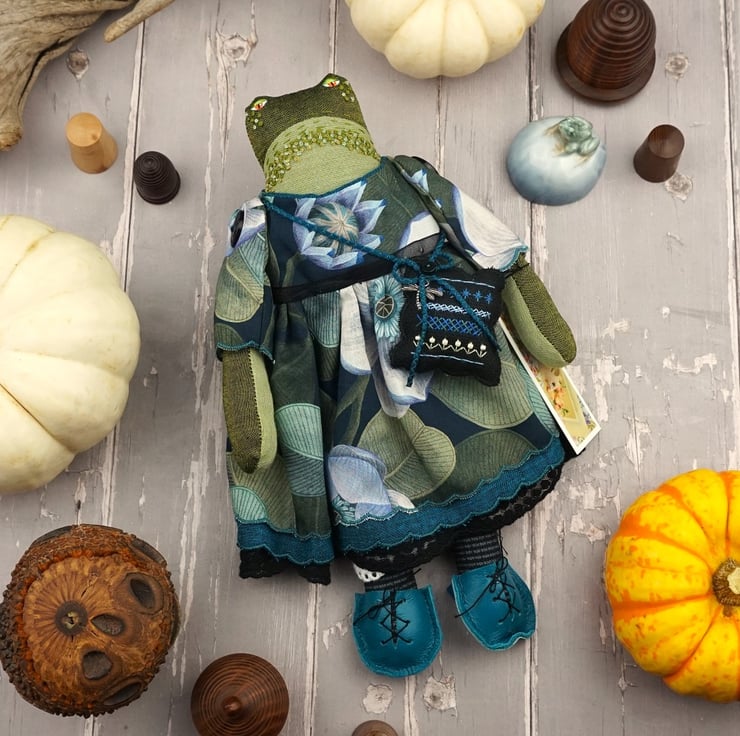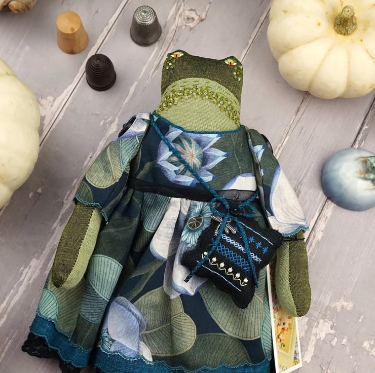 Edith is a tiny midnight grumpy frog with a sweet nature. She stands just nine inches tall. She is a tubby frog with hand painted features and hand embroidered details. She is dressed in a lovely fine tana lawn by Liberty called Rosea in blacks and blue with a hint of turquoise. She has coordinating underskirts in cotton and black lace and white bloomers in matching cotton..