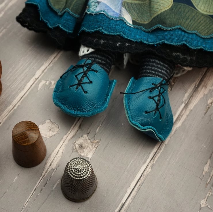 She is softly stuffed with a good stuffing, has a malachite crystal heart for strength and lots of rosemary in her stuffing for a gentle scent. She is finished with organza ribbon, tiny buttons and little leather shoes. She sports a sampler pillow with a dragonfly charm.