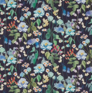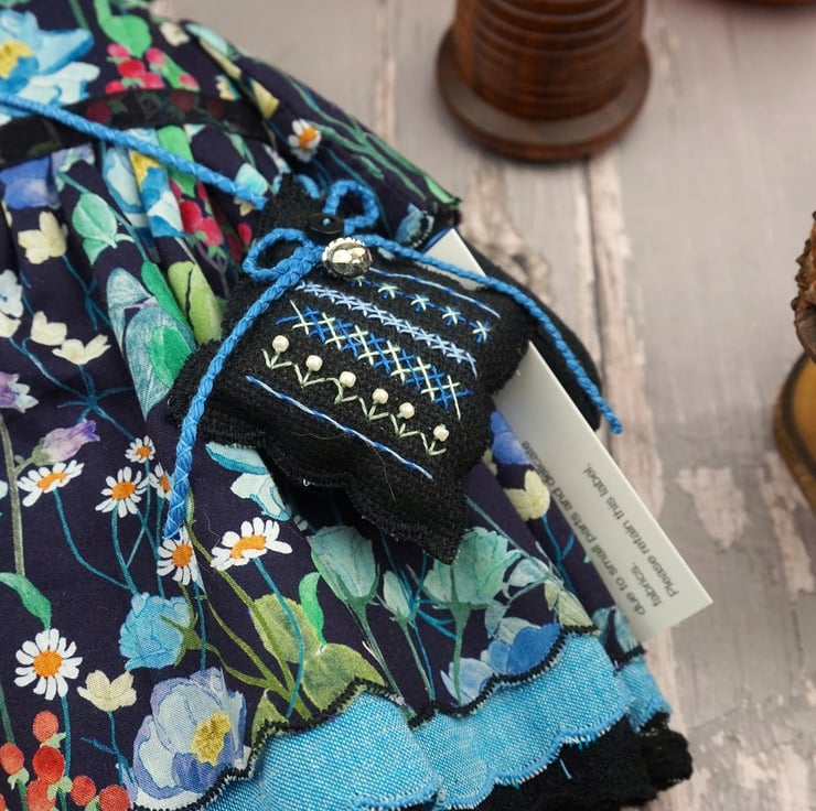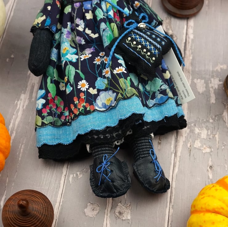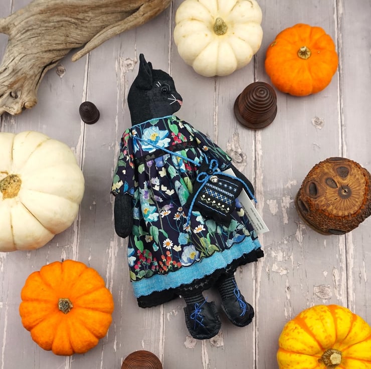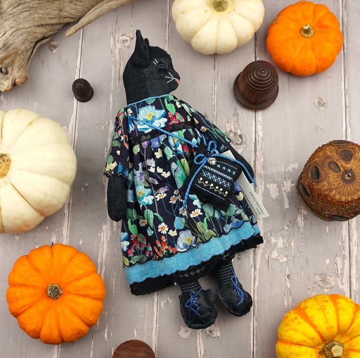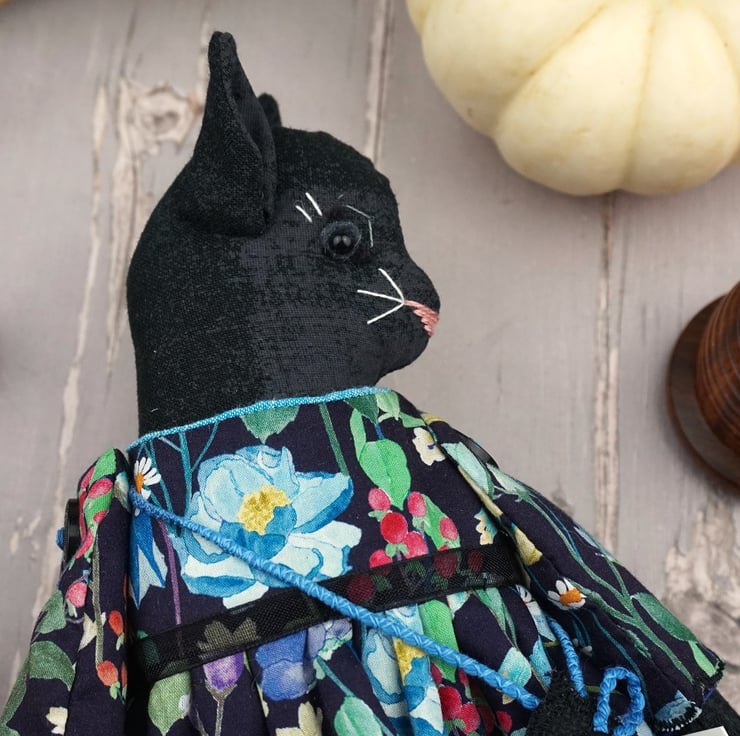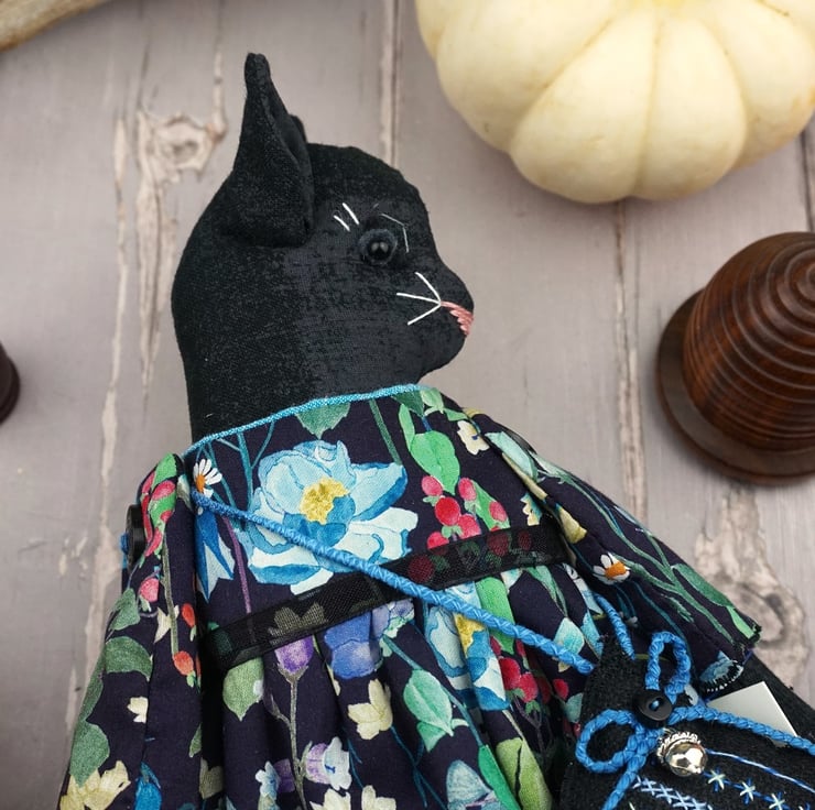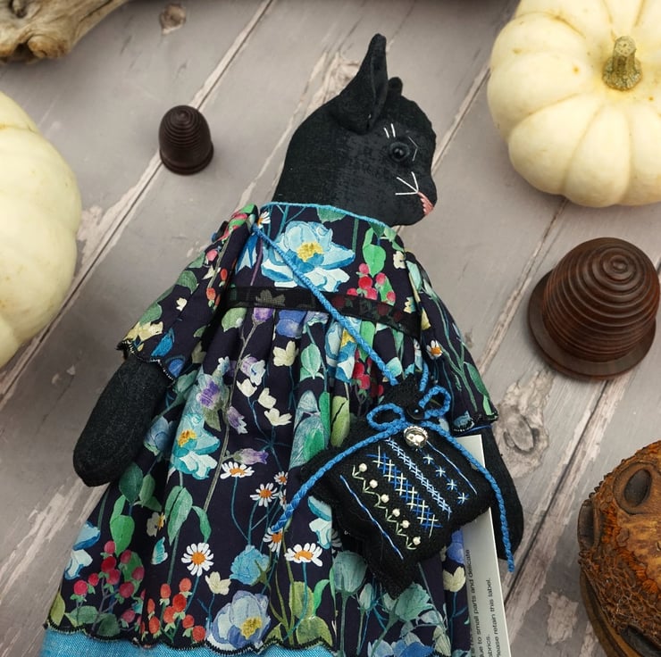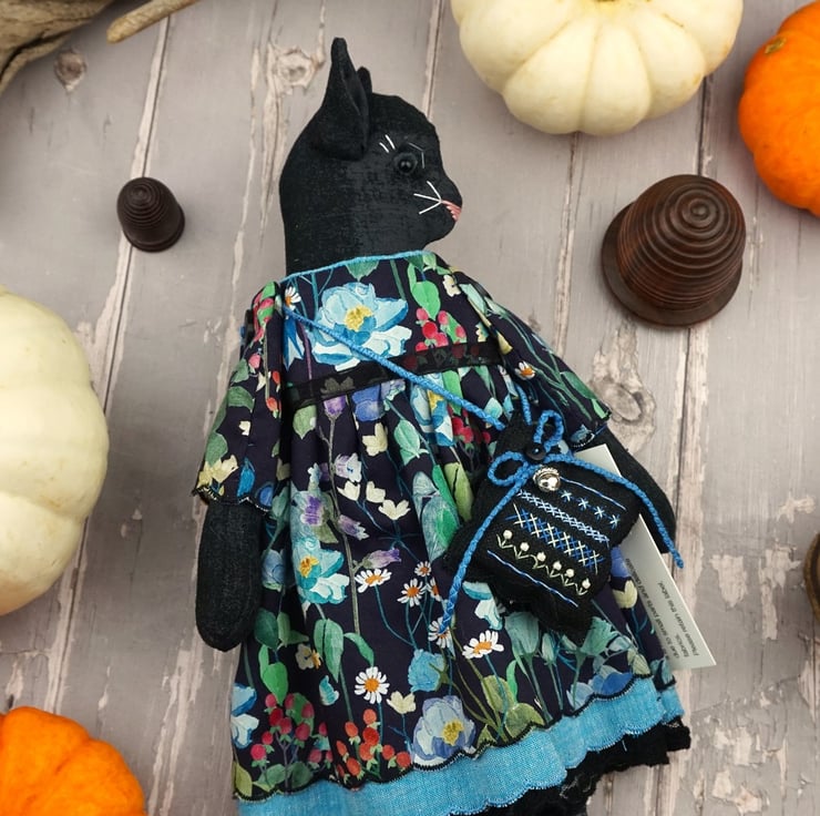 Clara is a little midnight kitten doll with a black glass bead eye and a gentle disposition. She is dressed in a Liberty print called Fairytale Forest with a black ground that has blue florals running across the fabric. Detailed with black tulle petticoats and turquoisel chambray underskirts she also sports Broderie Anglais drawers.