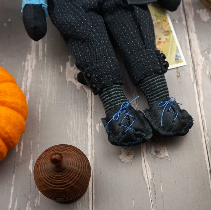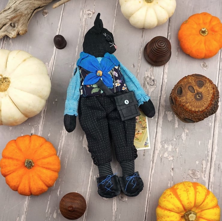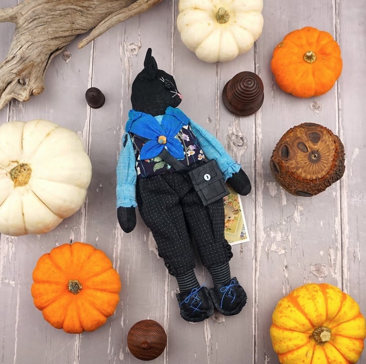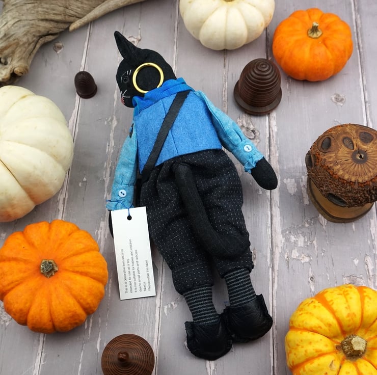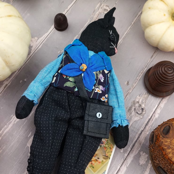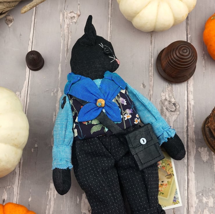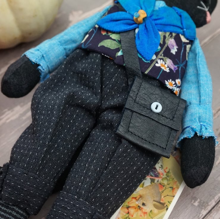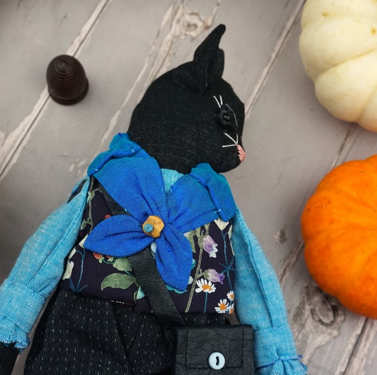 Claus is a little kitten doll with a brilliant black eye and a gentle disposition. He is dressed in a Liberty print waistcoat called Fairytale Forest, with lots of blue and turquoise flowers on a black ground. Detailed plus fours in yarn dyed black cotton, a chambray shirt and leather boots with a silk azure blue cravat.