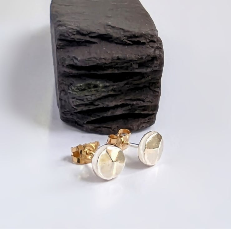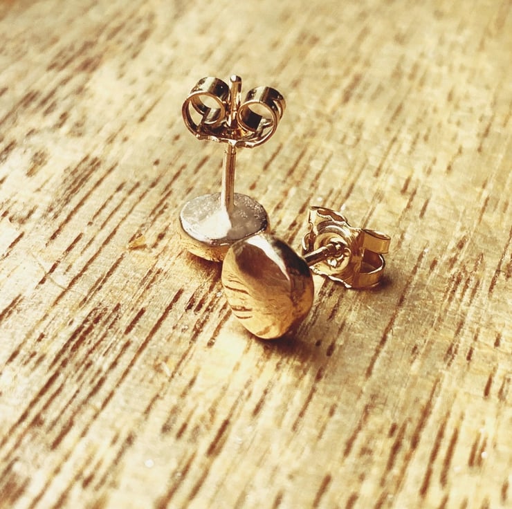 Handmade in my workshop, melting recycled 9 carat gold into a ball hammering into shape, soldering on a 9 carat gold post and finally polishing the little stud earrings.