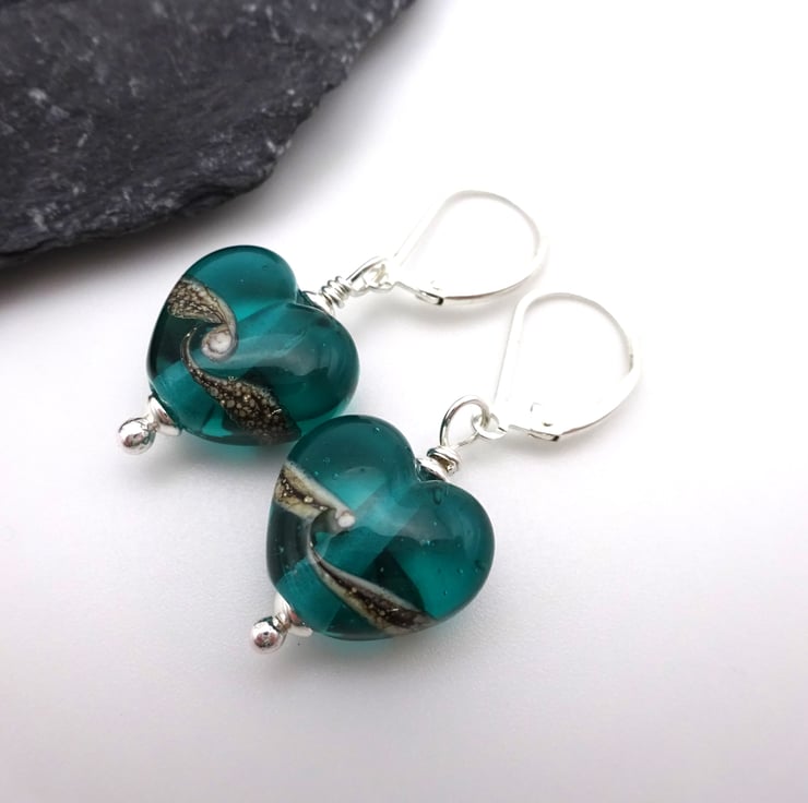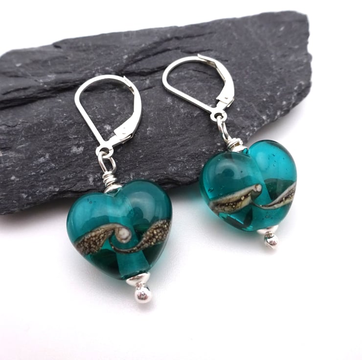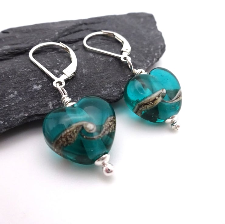 They feature sterling silver lever back ear wires, sterling silver beads and handmade lampwork glass heart beads.