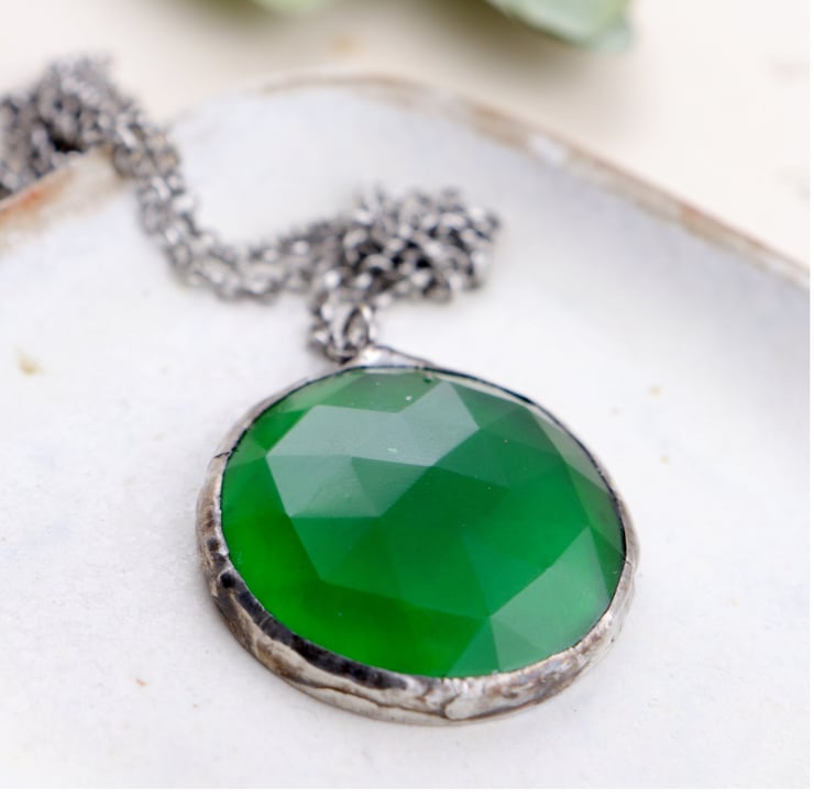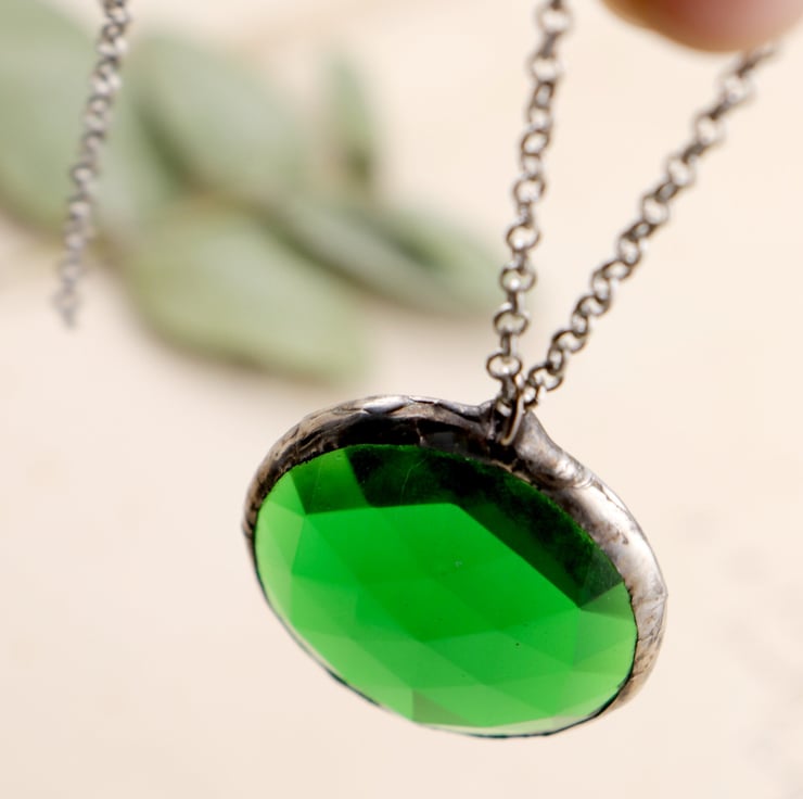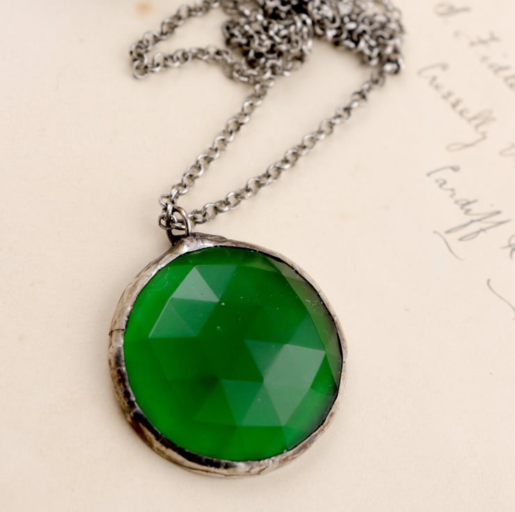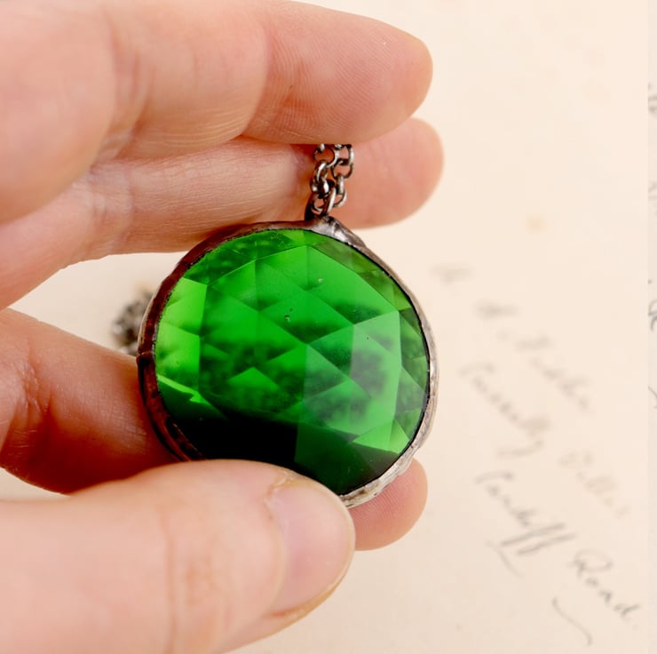Simple and unique piece of statement jewellery in art deco style made of faceted glass in, lovely rich emerald colour.