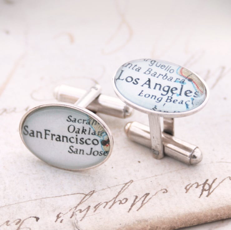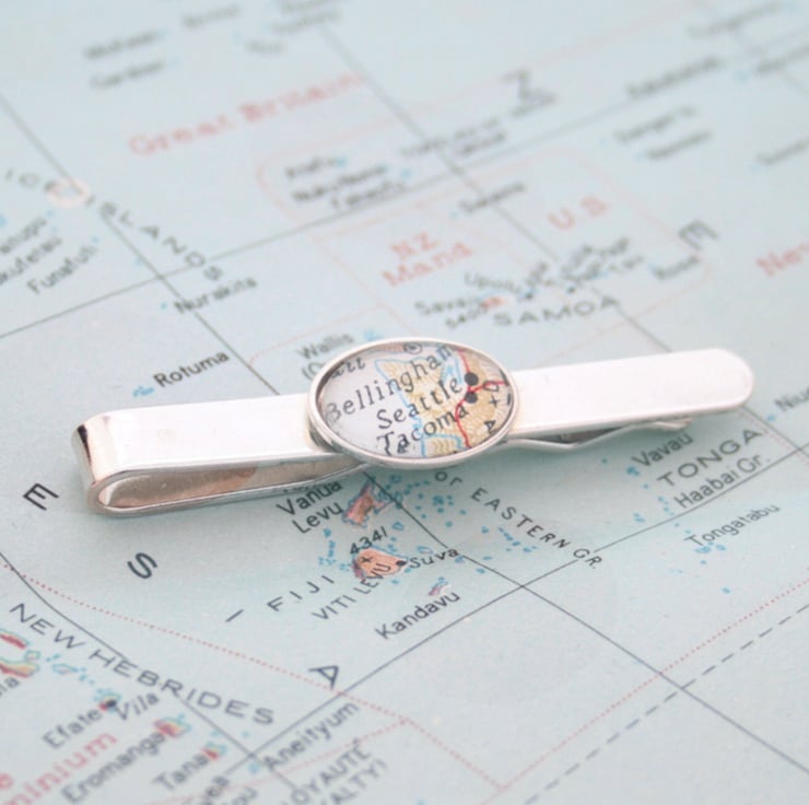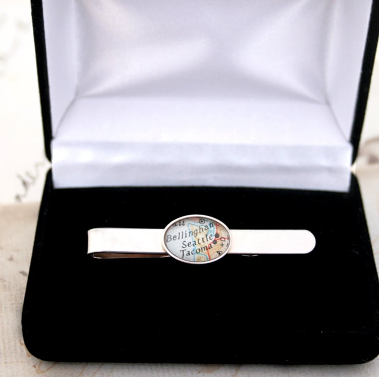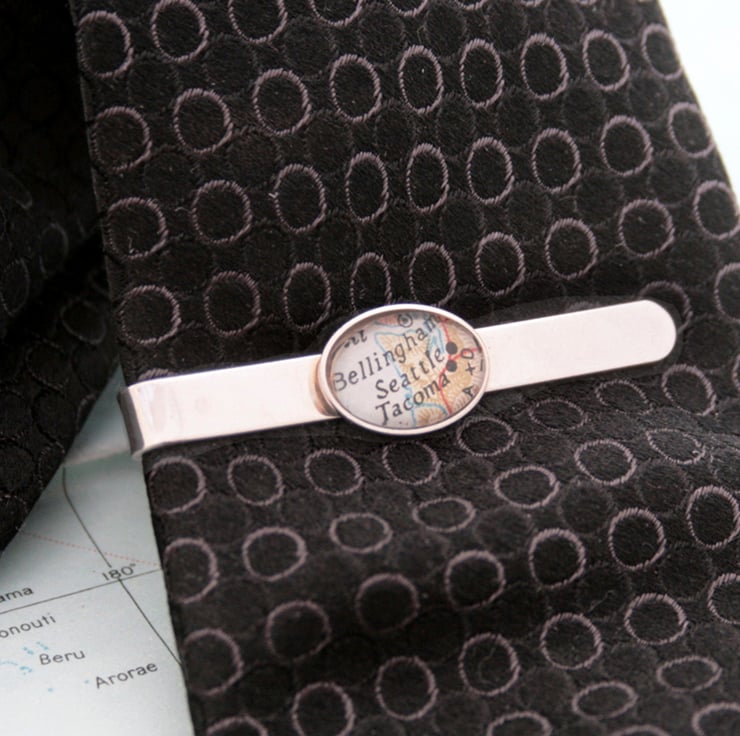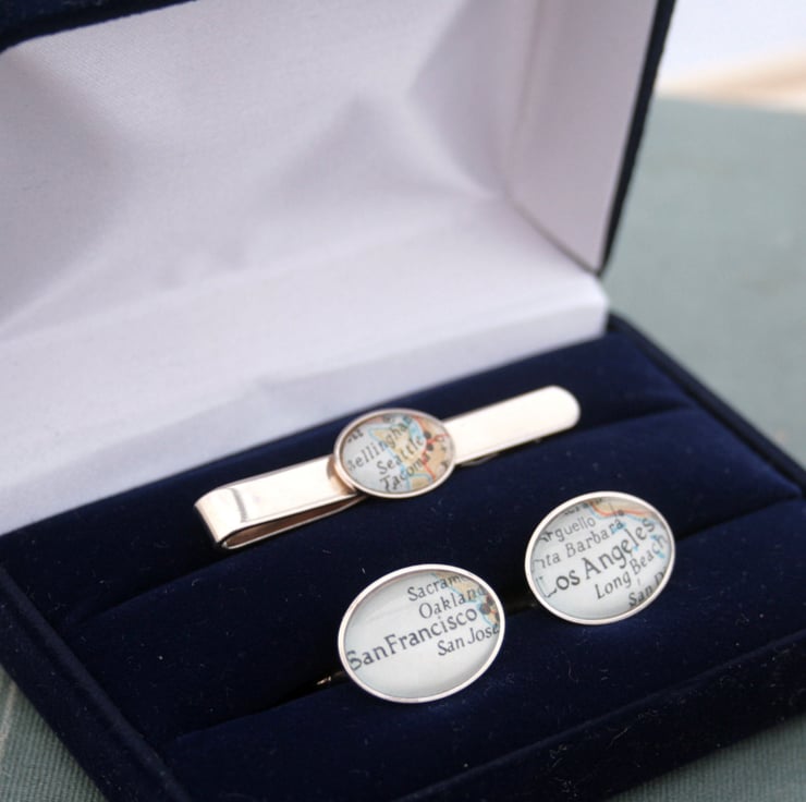 A timeless and meaningful gift — this handmade sterling silver tie bar and cufflink set features authentic vintage maps of three special locations you choose.