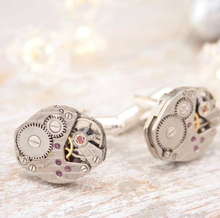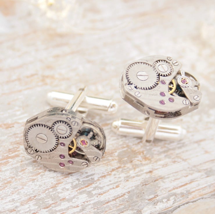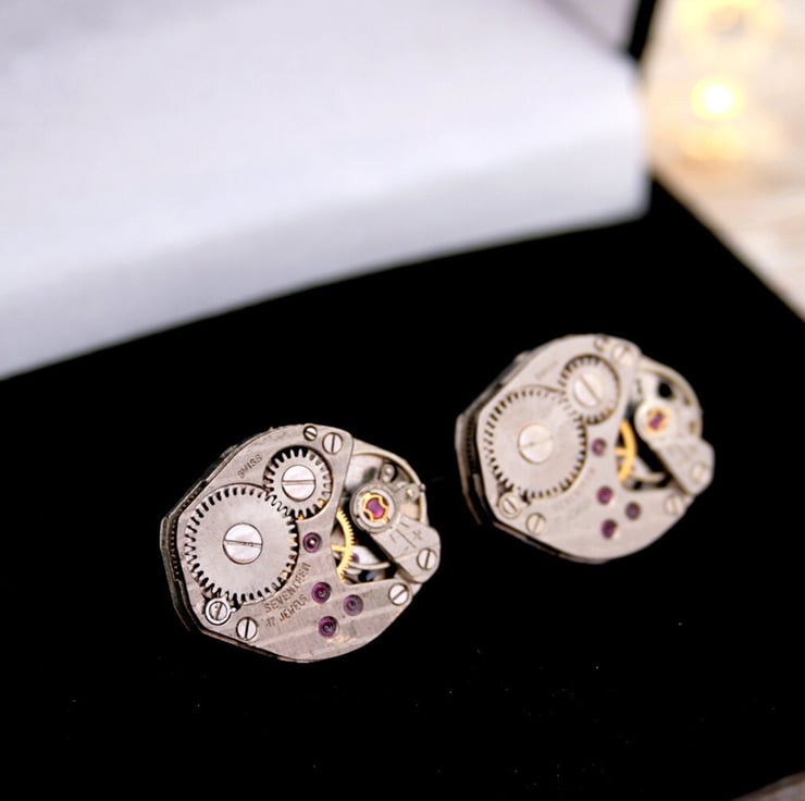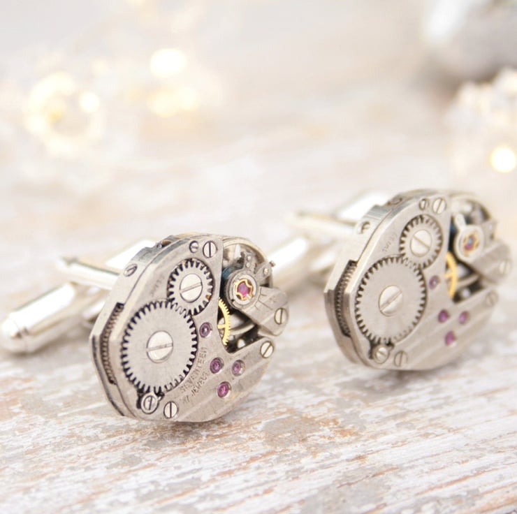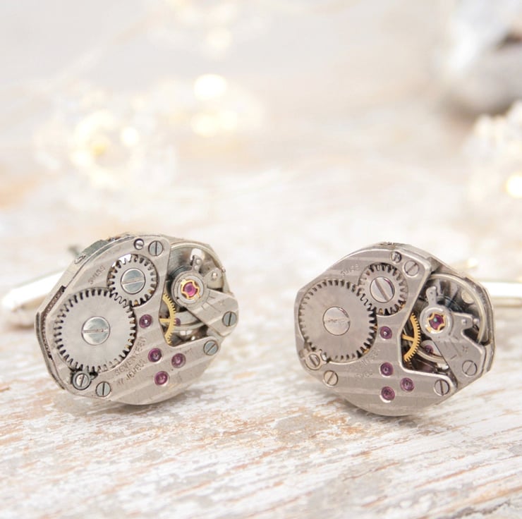 Stunning Swiss watch movements turned into unique cuff links will impress even the most discerning guy. They can work fantastically as fiancée cufflinks (he would be thrilled!)