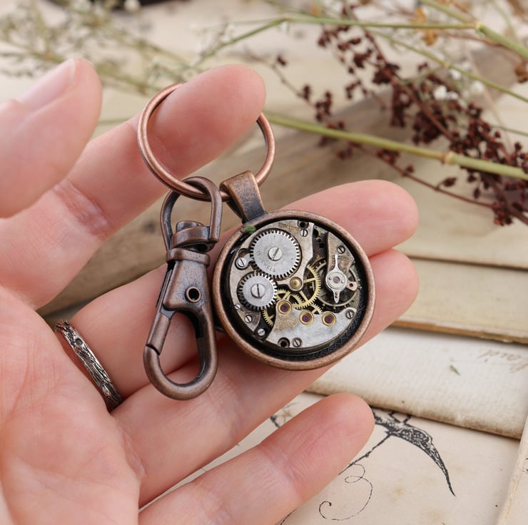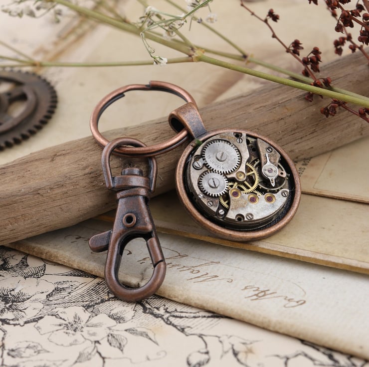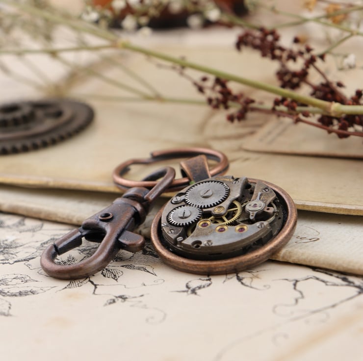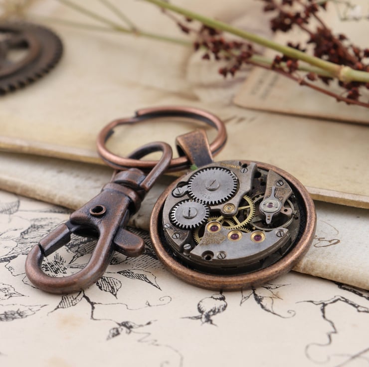 Looking for a distinctive gift to celebrate your copper anniversary? Look no further than this exquisite Copper Steampunk Keychain. Expertly handcrafted using recycled watch movement, this keychain showcases the intricate gears and cogs that lie within timepieces, giving it an authentic steampunk appeal. With its durable copper construction, it's not only a fabulous accessory but also a perfect memento for your special day.
