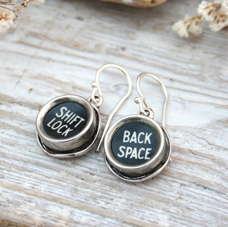 Typewriter key earrings with `Back Space` and `Shift Lock` function keys