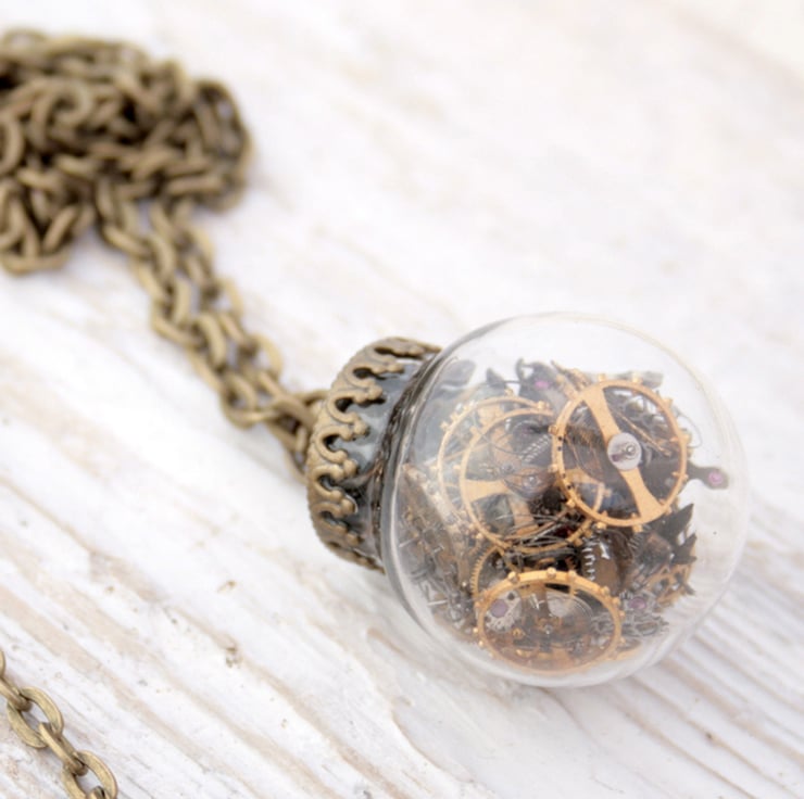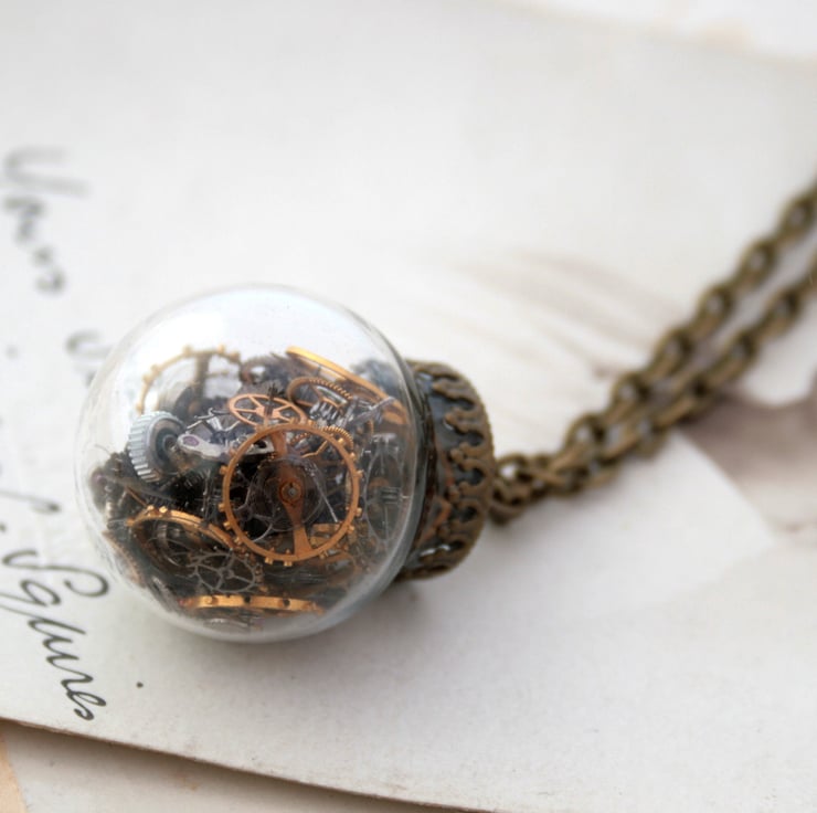 Glass dome globe terrarium necklace and vintage watch parts on a long chain