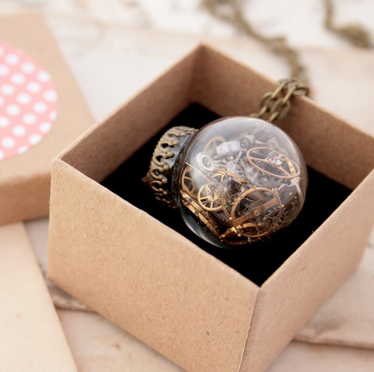 The wheels, barrels, cogs, wind ups and other watch parts inside create a cool moveable world. It can be shaken like a snowglobe or just idly tapped.