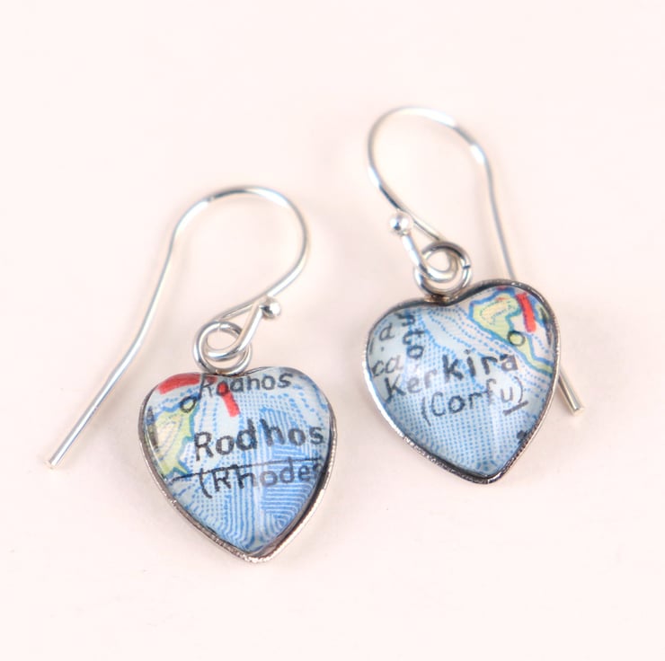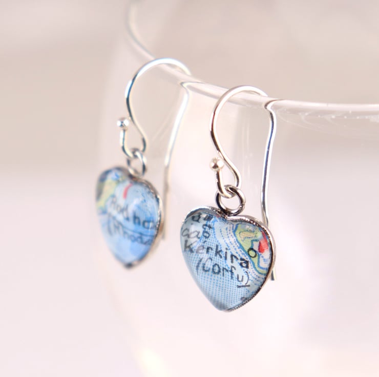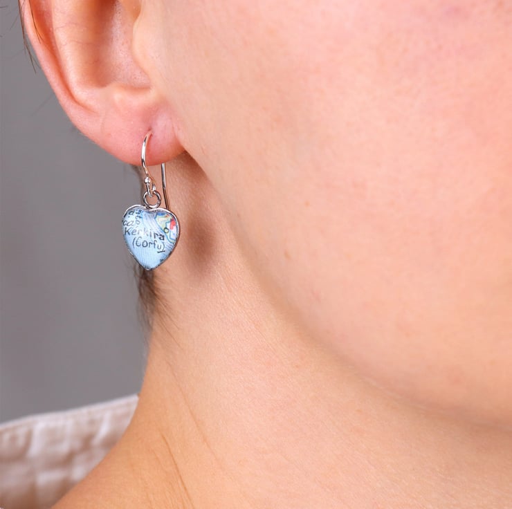 Stunning custom jewellery map dangle earrings in heart shape and silver colour are a fantastic gift idea for a travel-loving friend for any other occasion you want to surprise her!