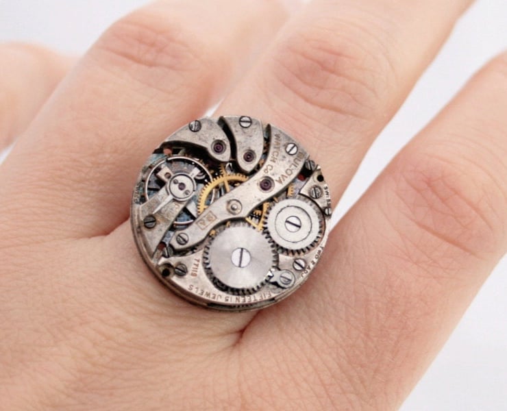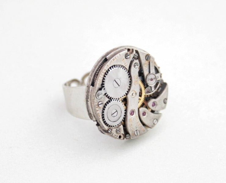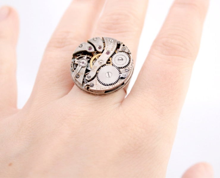 This ring features the authentic heart of a classic Swiss watch. The movement cannot work as a timepiece anymore but looks totally cool.