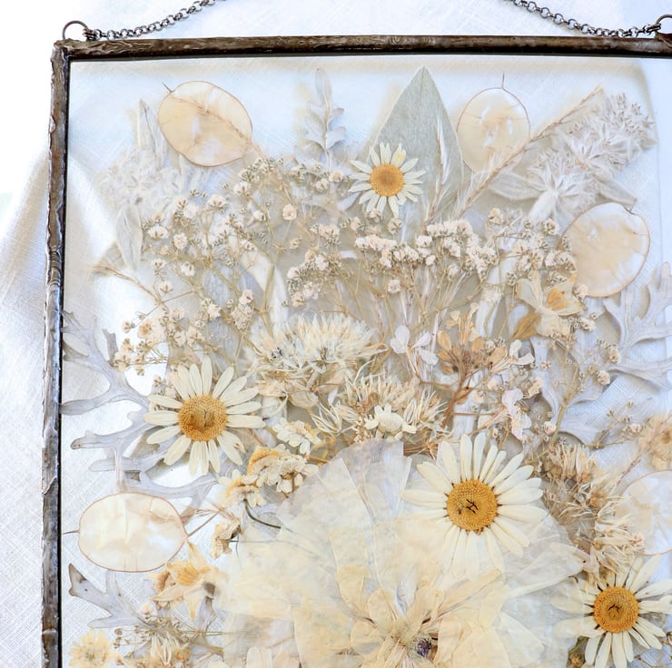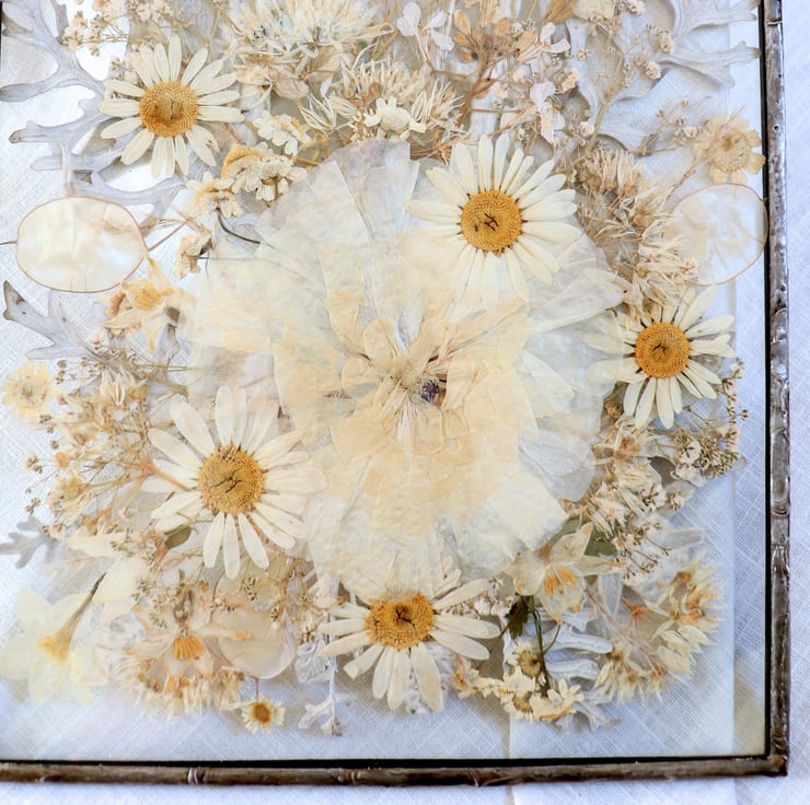 Real, dried flowers in tones of white and off-white framed in glass using stained glass technique.