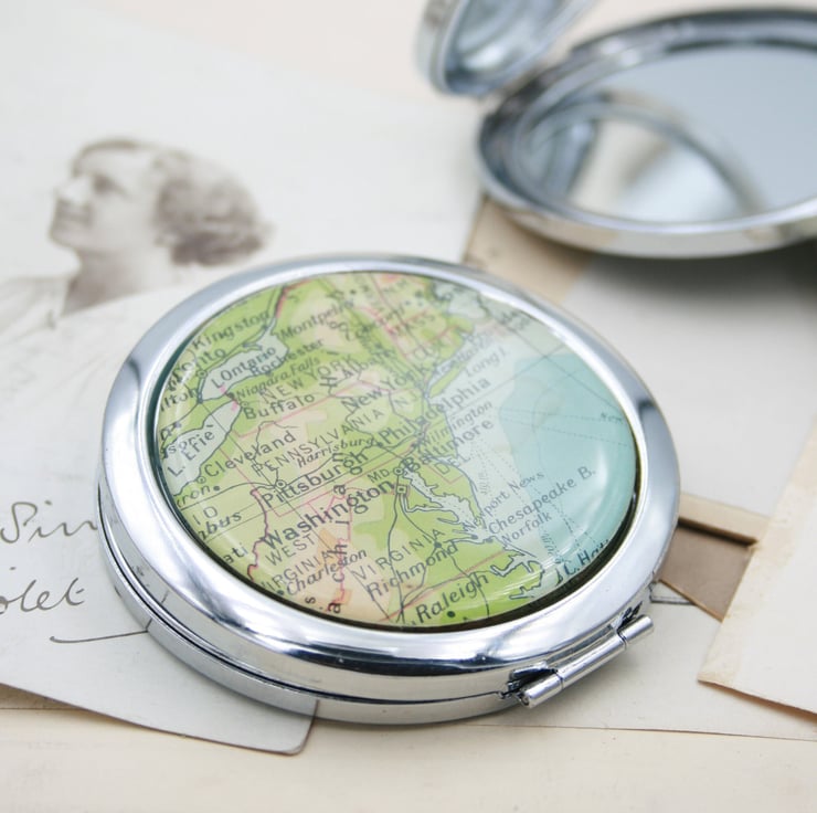 Each Item I make is carefully handmade using real maps, not printout nor photocopies - always genuine maps and atlases to make each item really special; the maps are hand-cut to shape of a n acrylic sticker (which slightly magnifies the map) and fitted into the mirror case.