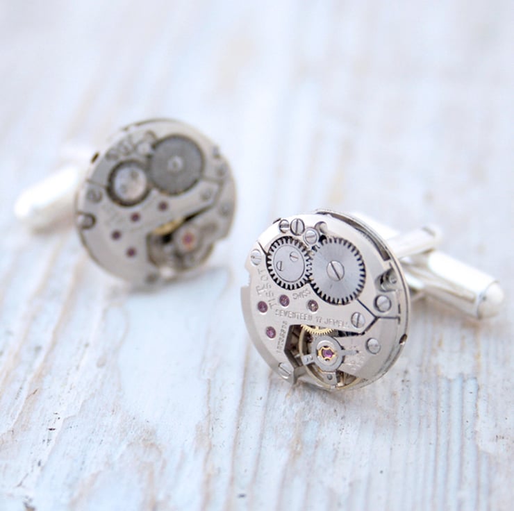 Modern cufflinks with steampunk watch movements on sterling silver backs. Luxurious Xmas gifts idea for men.