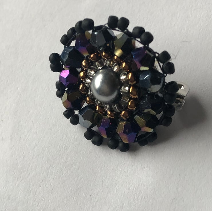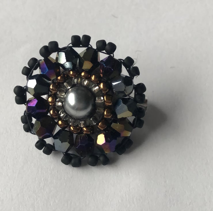 Made with tiny black crystals, copper seed beads with a central grey satin pearl, the brooch is 2.5cm in diameter