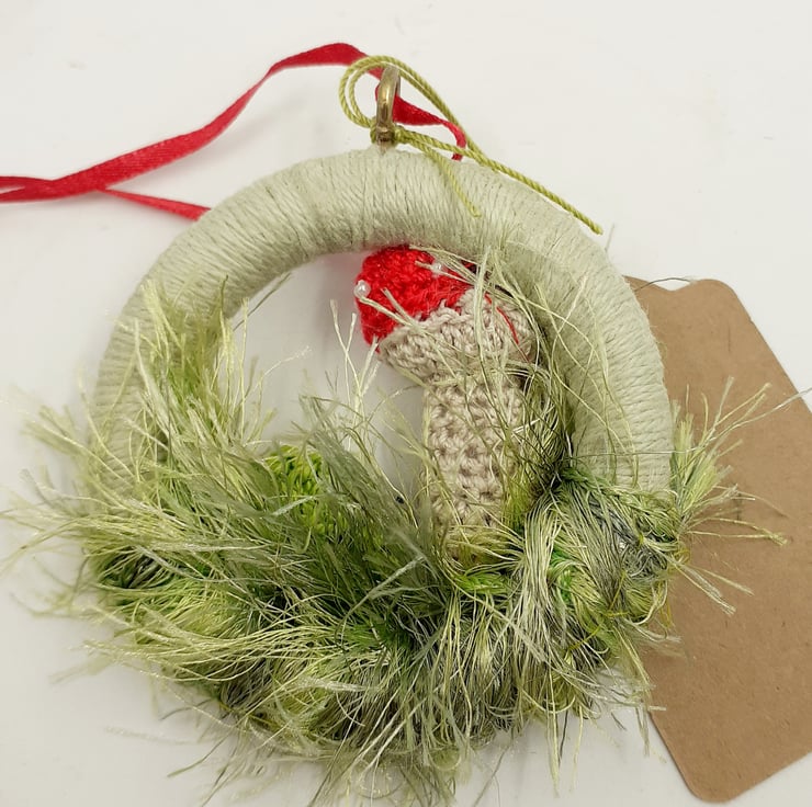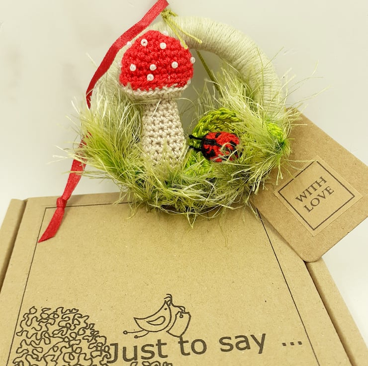 The toadstool, ladybird and leaf on this cheerful decoration have been crocheted and embroidered in cotton. The spots on the toadstool are tiny beads and tge grass is made from eyelash yarn wound round the wooden ring. There is a narrow ribbon hanging loop and a tag which reads, With Love, although I am very happy to exchange this tag for one with wording of your choice. The decoration measures approximately 7.5cm in diameter and comes wrapped in tissue in a labelled PIP ( Postage in Proportion) box, all ready to be given or posted on. It would make a sweet alternative to a greetings card and a pretty keepsake decoration for many years to come.