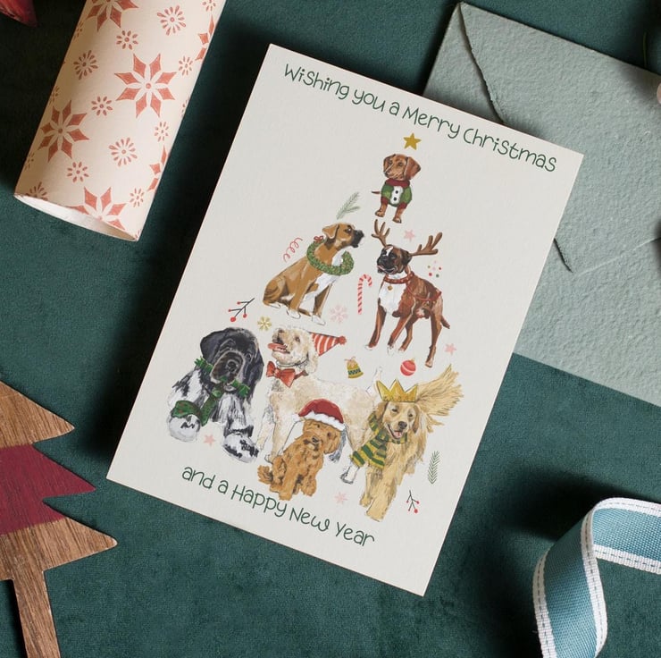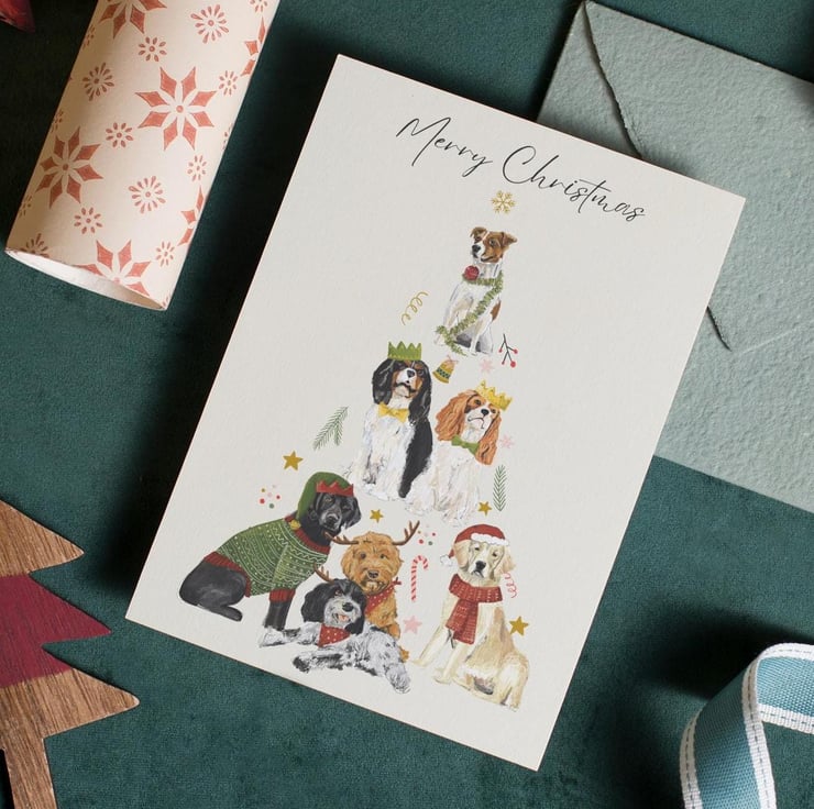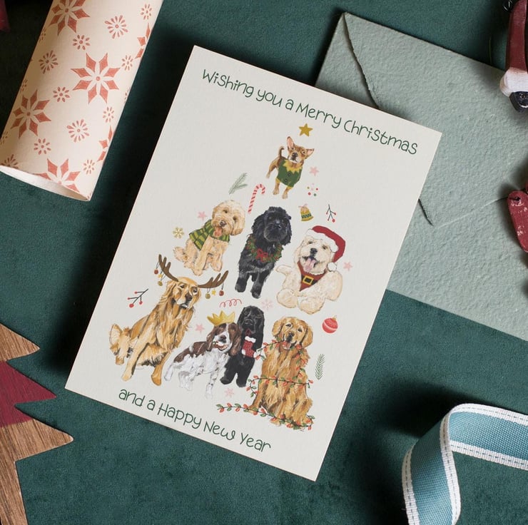 Each card has different breeds that go from large to medium to small dog breeds and make the shape of a Christmas (fur) Tree.