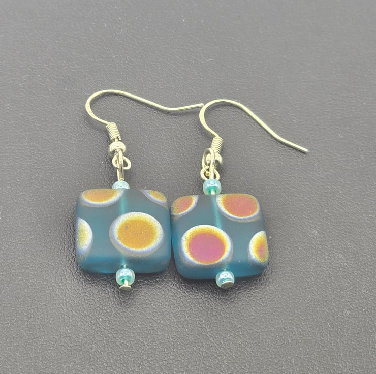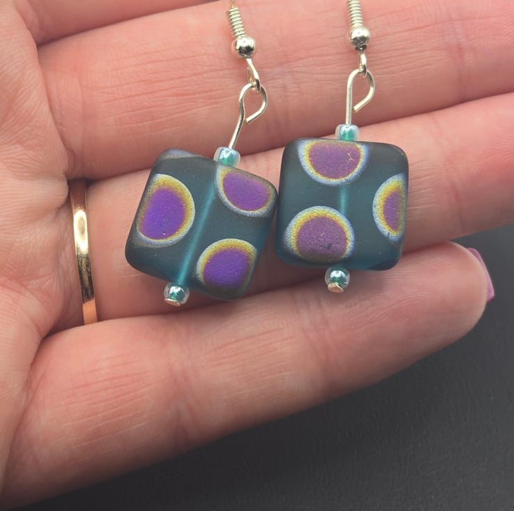 The earrings have been made using turquoise matt czech glass square beads with a peacock pattern. The squares are 10mm. They peacock pattern can vary on each bead in location and colour. I've paired them up as closely as possible.They have an aqua green seed bead above and below the square bead.
