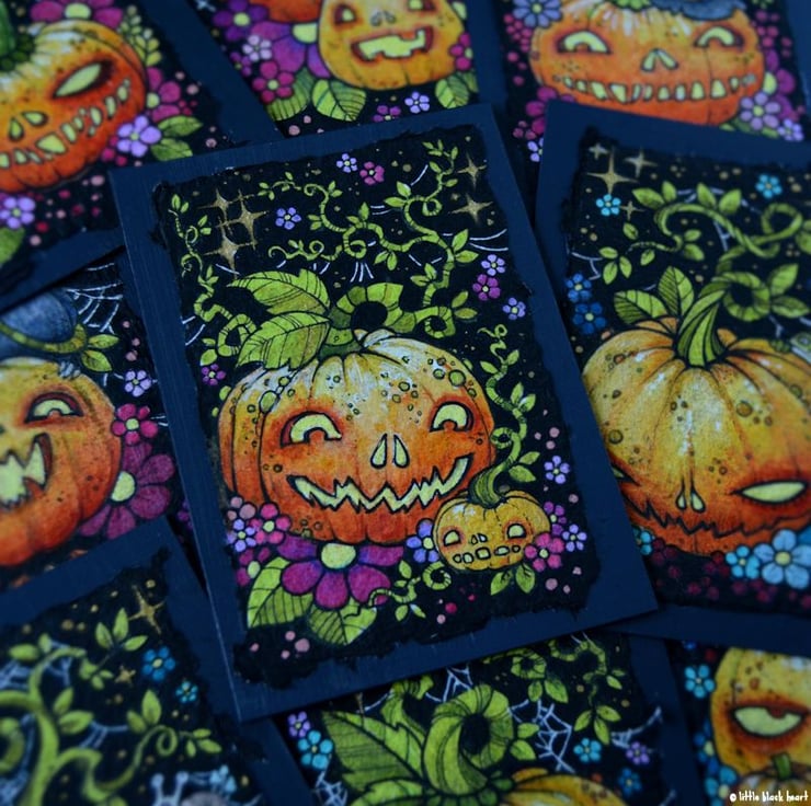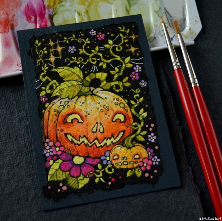this aceo is an original artwork, hand drawn with a tiny 0.05 nibbed pen, then coloured with ink, artists pens and watercolour paints, on indian khadi paper. khadi paper is handmade from recycled cotton rag, it has a lovely textured surface and deckled edges. i have then mounted the illustration onto 300gsm cardstock, hand painted with a paynes grey to create a dark surrounding edge/background.